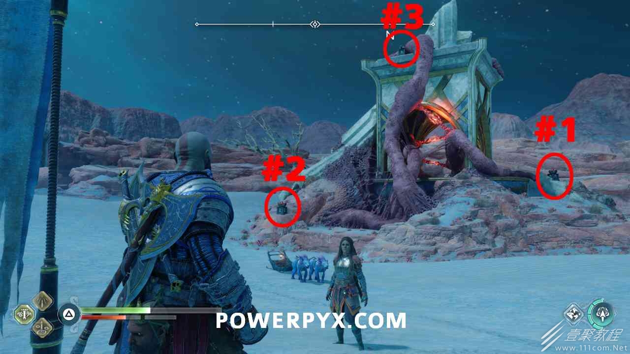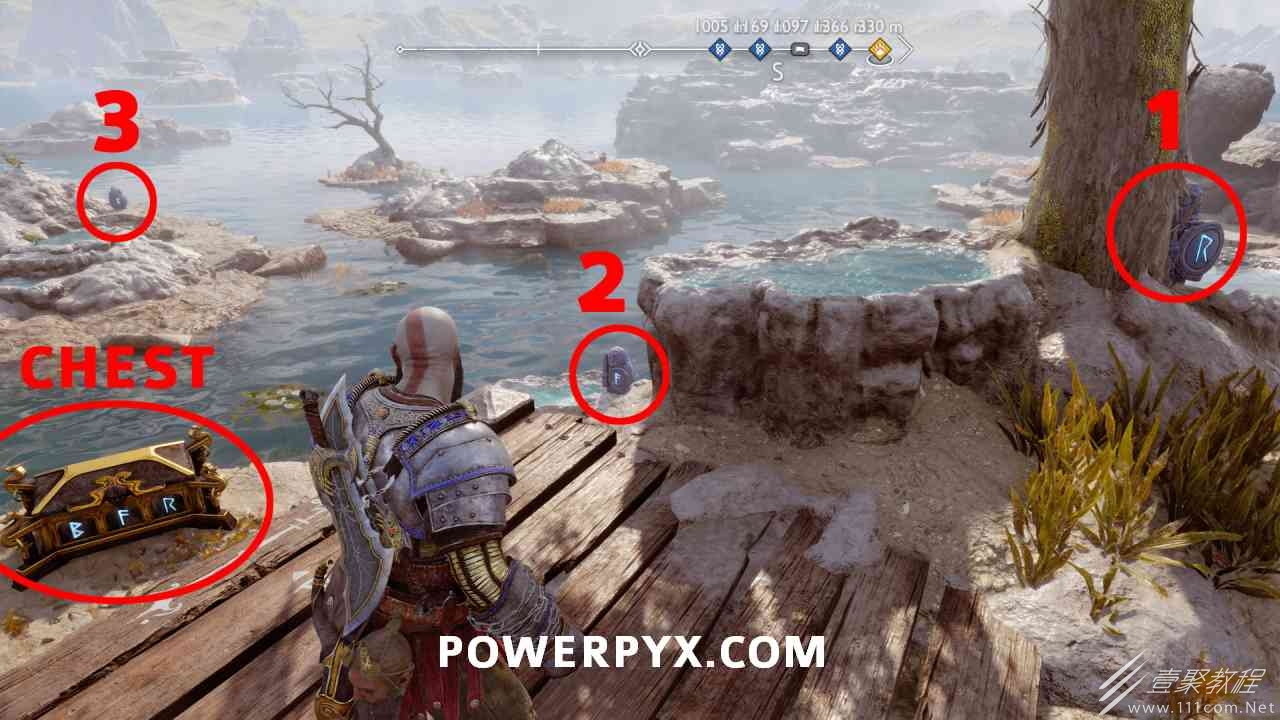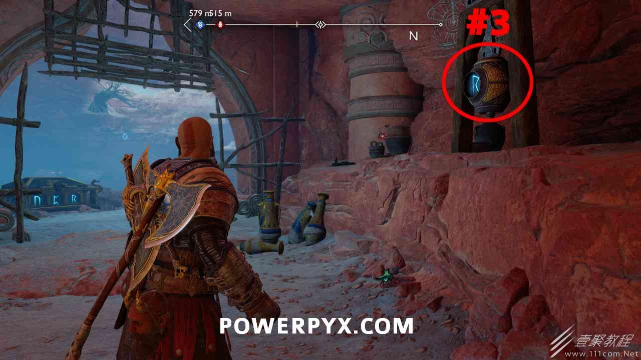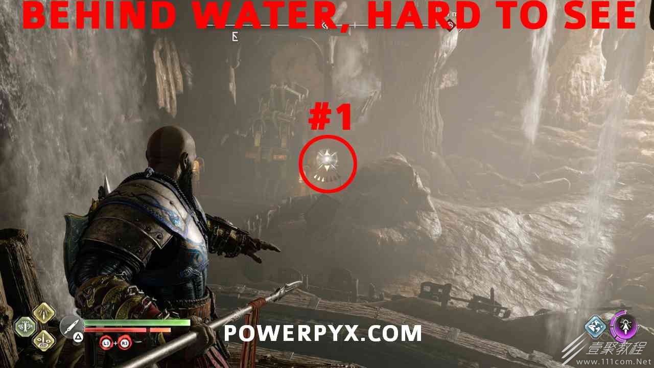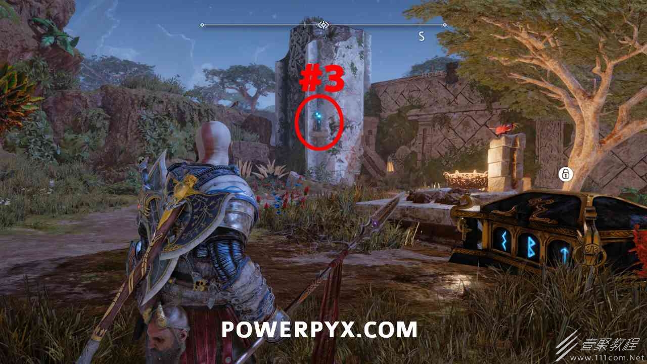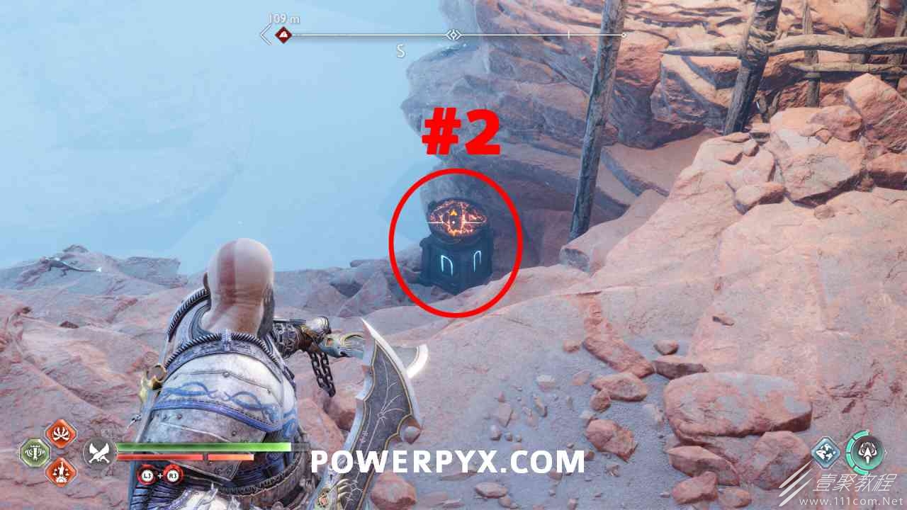 之间的路径上(基本上是这两个区域之间的入口/出口)。你必须将长矛投掷到3个字形封印处并同时炸毁它们。第一个是在胸部的右侧,在一些水后面的远处。这个很难看到,你可以在水中看到蓝色的微光,当瞄准它时,标线应该会改变(见下面#1的图像)。第二个是裂缝所在的箱子的左侧,必须向爆炸花瓶投掷斧头以清除瓦砾,然后字形变得可见。第三个在中间的小路上,旁边是一个神秘的门户。炸毁所有 3 根长矛:三角形:以打开箱子。