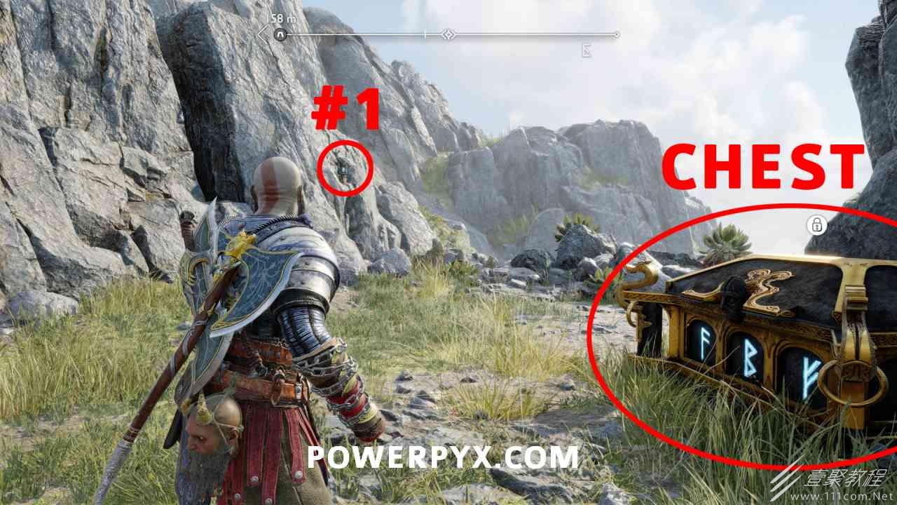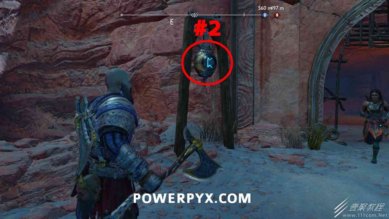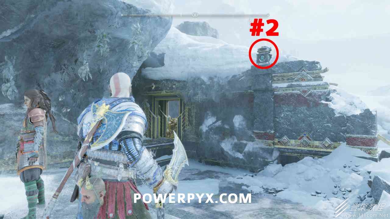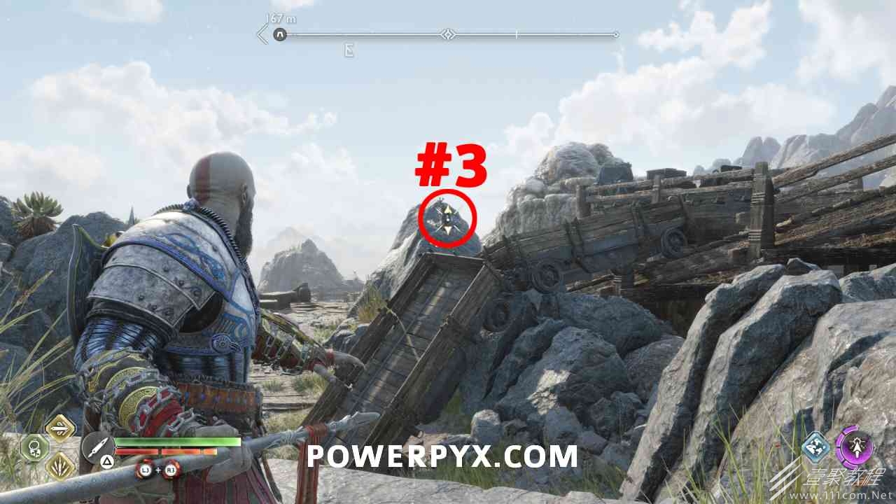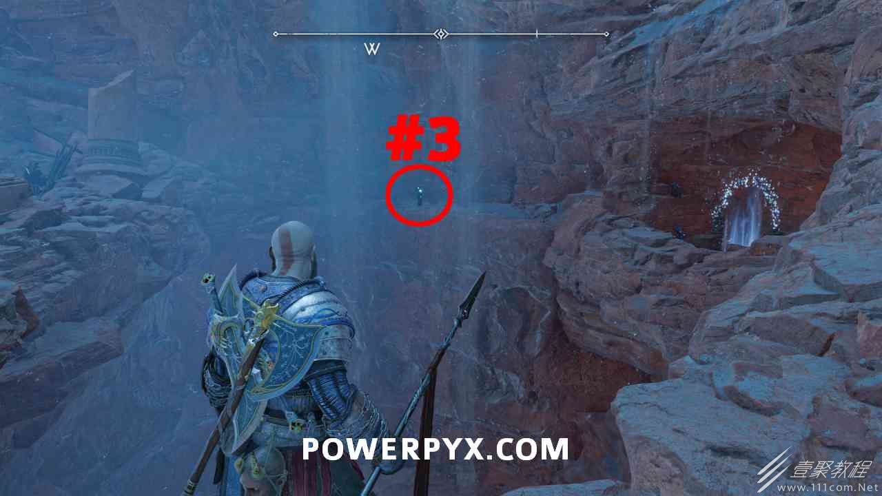 之间的路径上(基本上是这两个区域之间的入口/出口)。你必须将长矛投掷到3个字形封印处并同时炸毁它们。第一个是在胸部的右侧,在一些水后面的远处。这个很难看到,你可以在水中看到蓝色的微光,当瞄准它时,标线应该会改变(见下面#1的图像)。第二个是裂缝所在的箱子的左侧,必须向爆炸花瓶投掷斧头以清除瓦砾,然后字形变得可见。第三个在中间的小路上,旁边是一个神秘的门户。炸毁所有 3 根长矛:三角形:以打开箱子。