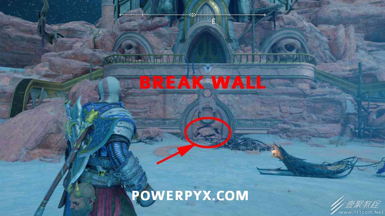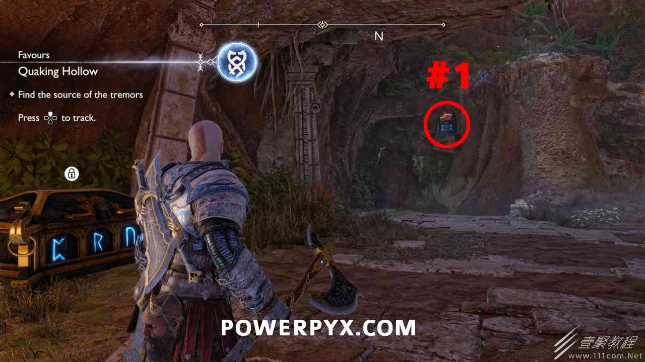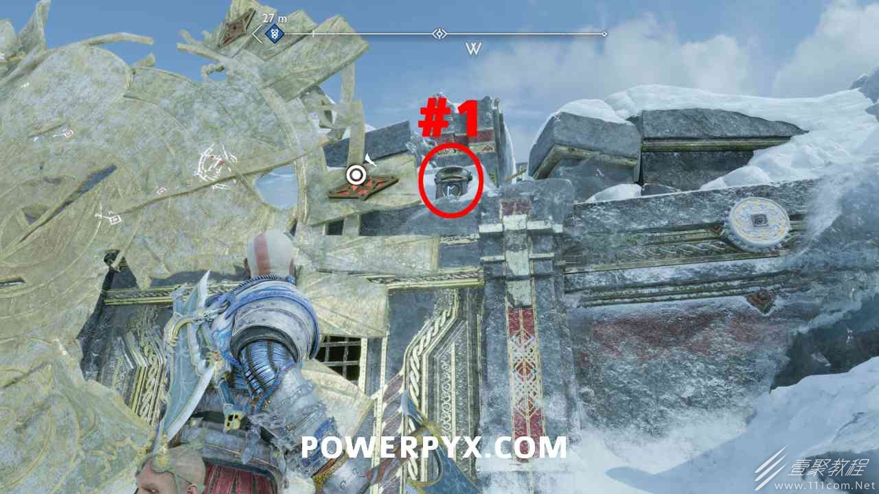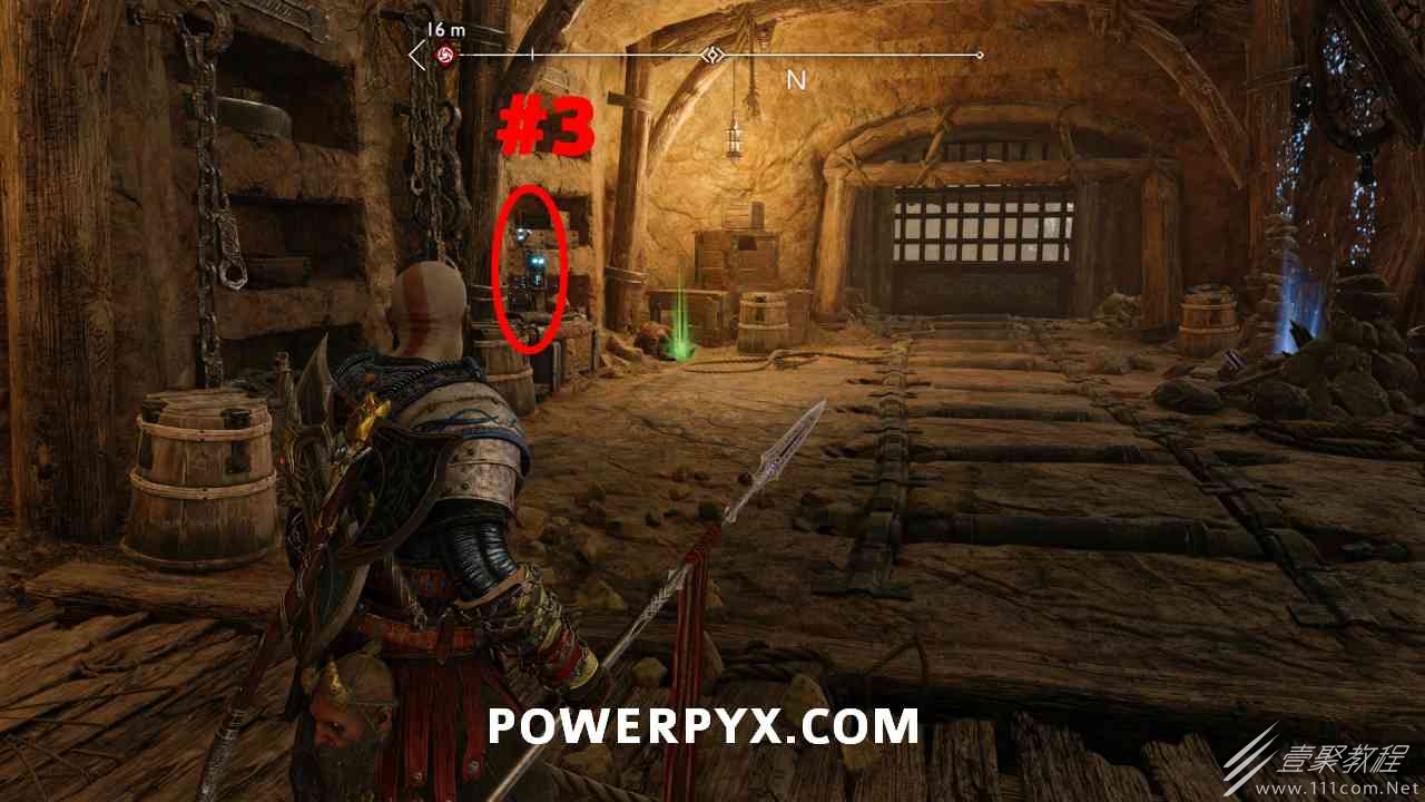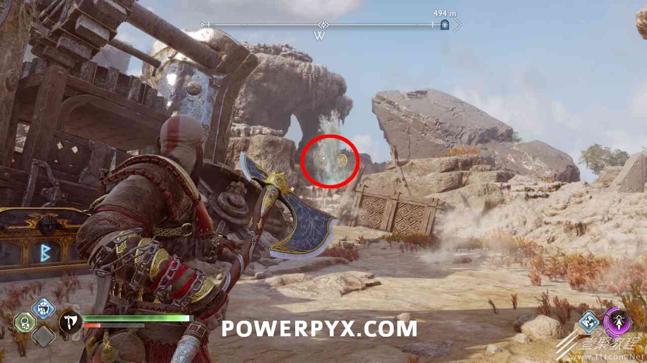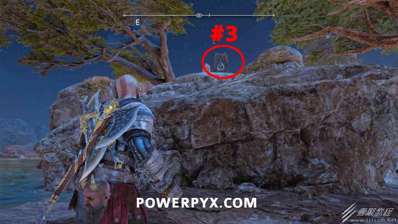 之间的路径上(基本上是这两个区域之间的入口/出口)。你必须将长矛投掷到3个字形封印处并同时炸毁它们。第一个是在胸部的右侧,在一些水后面的远处。这个很难看到,你可以在水中看到蓝色的微光,当瞄准它时,标线应该会改变(见下面#1的图像)。第二个是裂缝所在的箱子的左侧,必须向爆炸花瓶投掷斧头以清除瓦砾,然后字形变得可见。第三个在中间的小路上,旁边是一个神秘的门户。炸毁所有 3 根长矛:三角形:以打开箱子。
