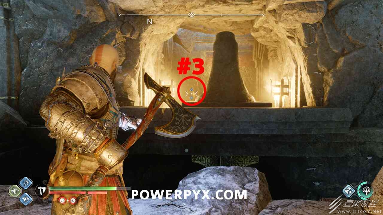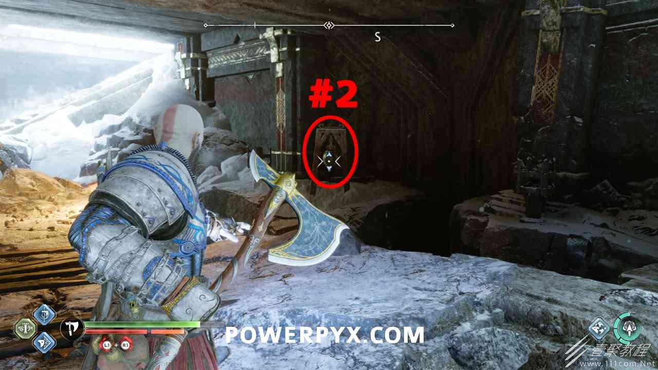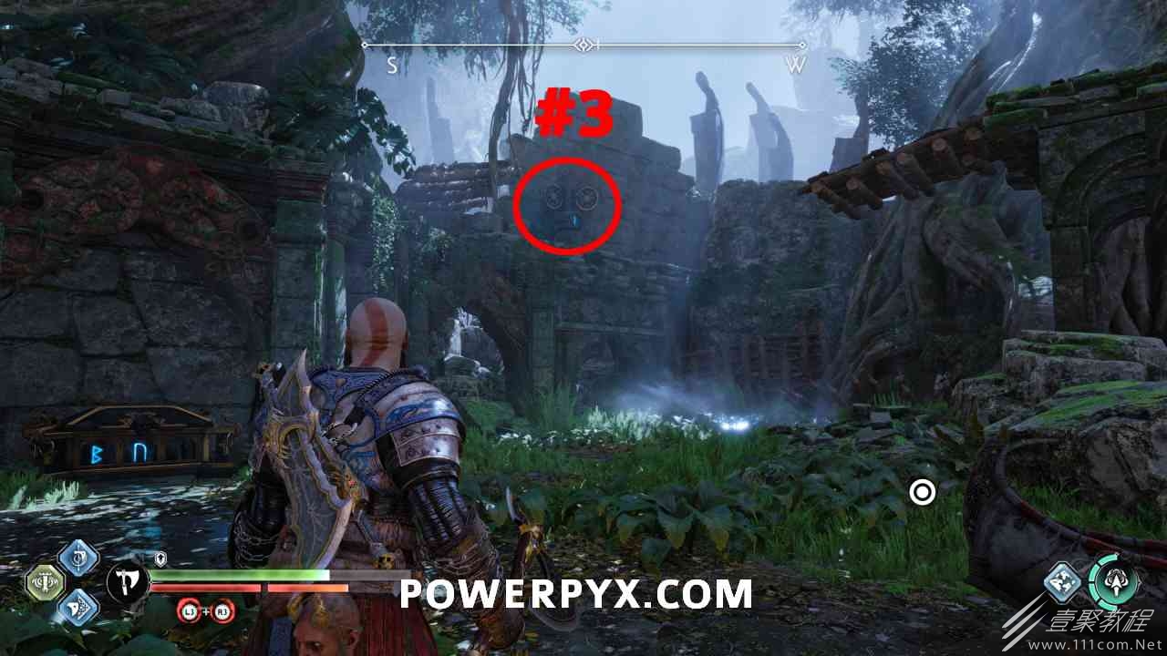 神殿的一半,几乎一目了然,很容易看到。你必须通过投掷斧头快速连续击中 3 个封印。#1是胸部最左边,#2是胸部最左边,#3在胸部右侧的走廊上(必须先射出绿色箭头清除前面的瓦砾)。当你足够快地击中所有 3 个封印时,箱子会打开。如果速度太慢,可以重试。使用+的:l2:快速投掷:r1:。