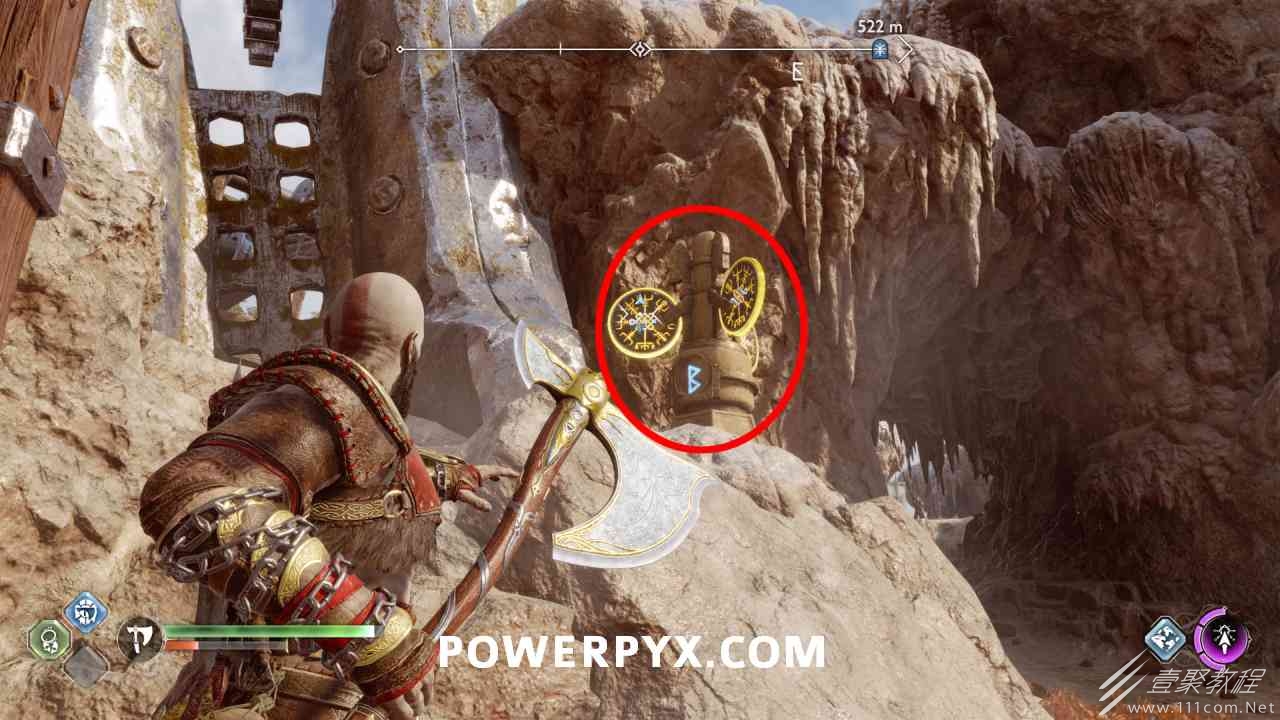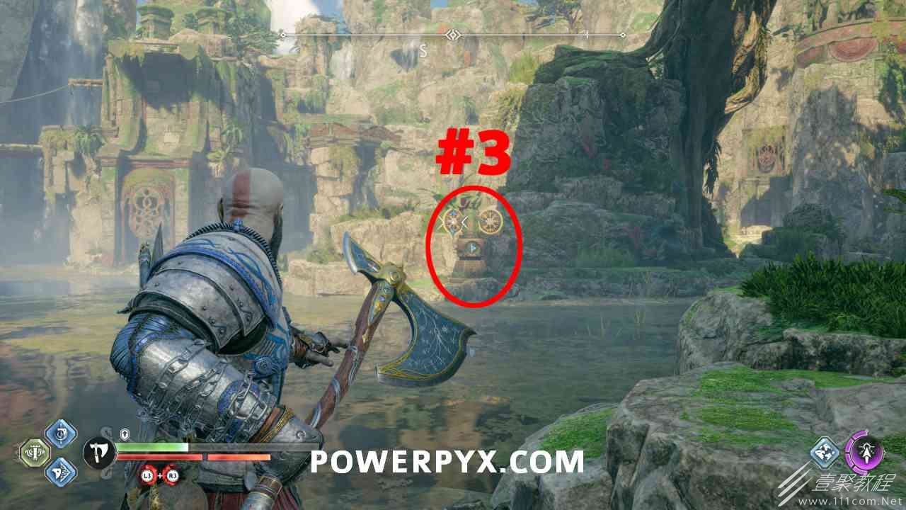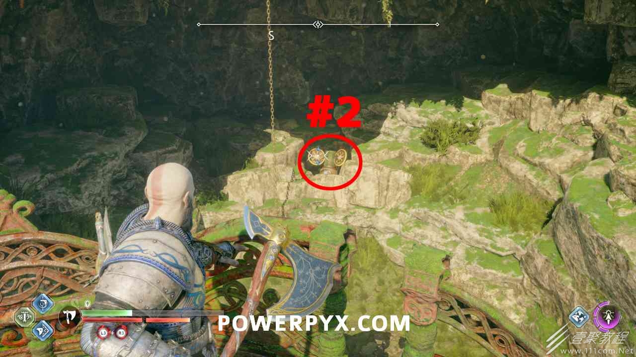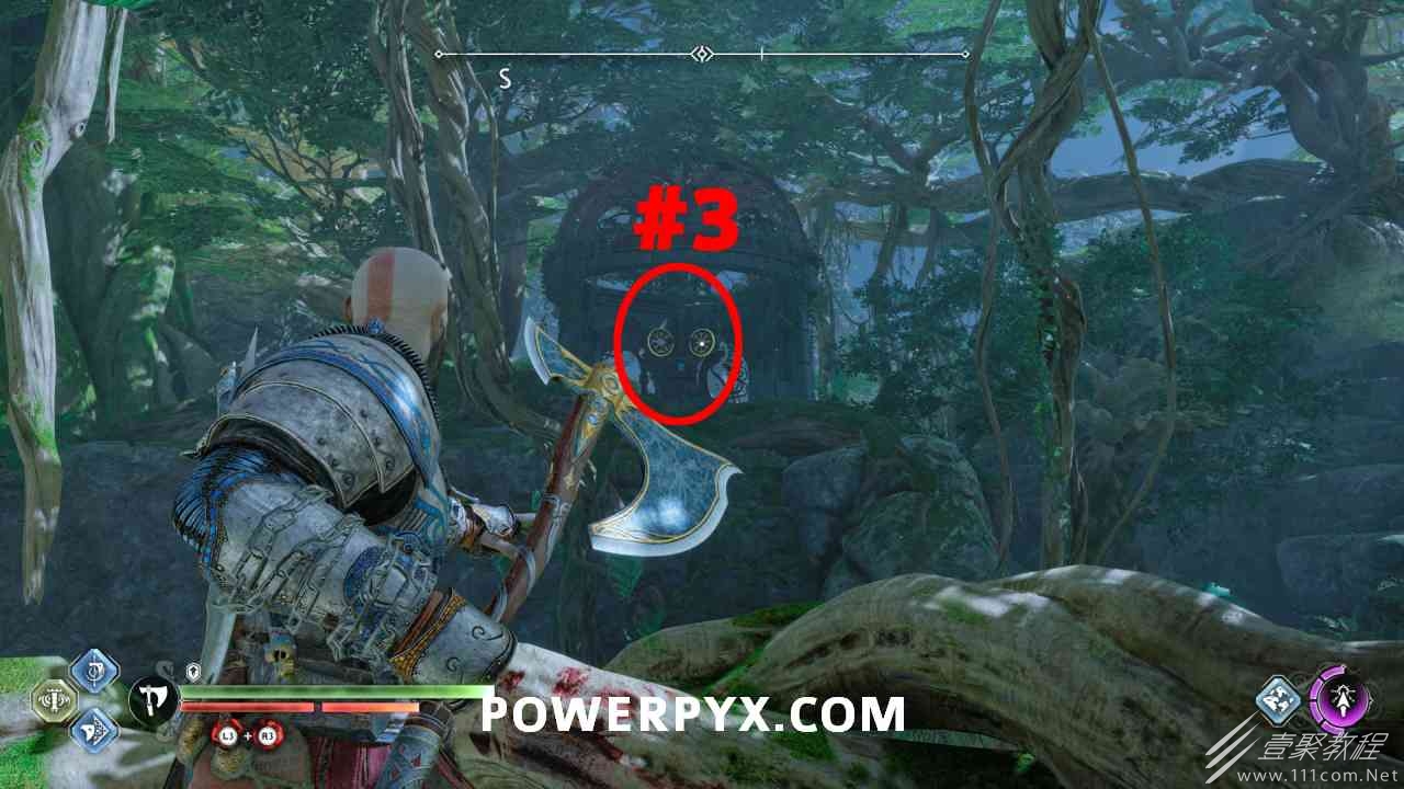 神殿的一半,几乎一目了然,很容易看到。你必须通过投掷斧头快速连续击中 3 个封印。#1是胸部最左边,#2是胸部最左边,#3在胸部右侧的走廊上(必须先射出绿色箭头清除前面的瓦砾)。当你足够快地击中所有 3 个封印时,箱子会打开。如果速度太慢,可以重试。使用+的:l2:快速投掷:r1:。