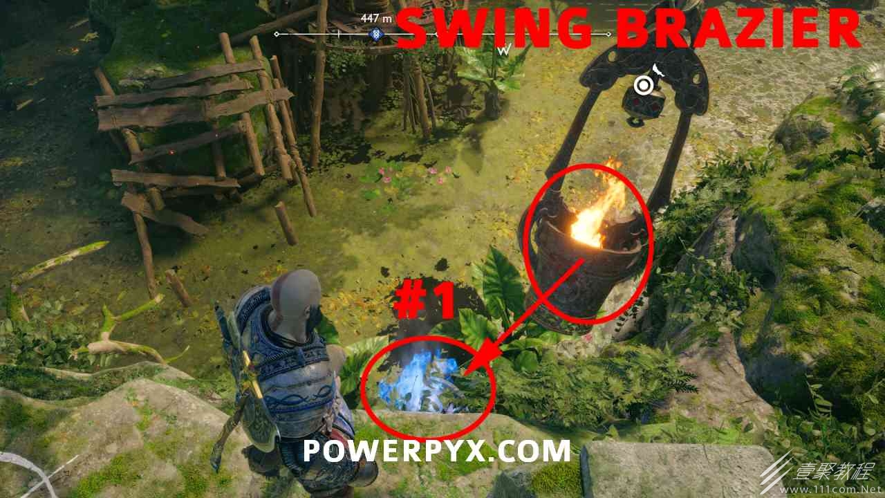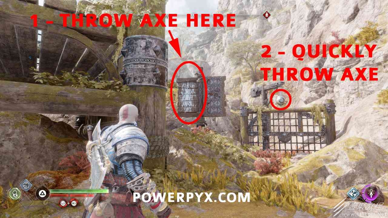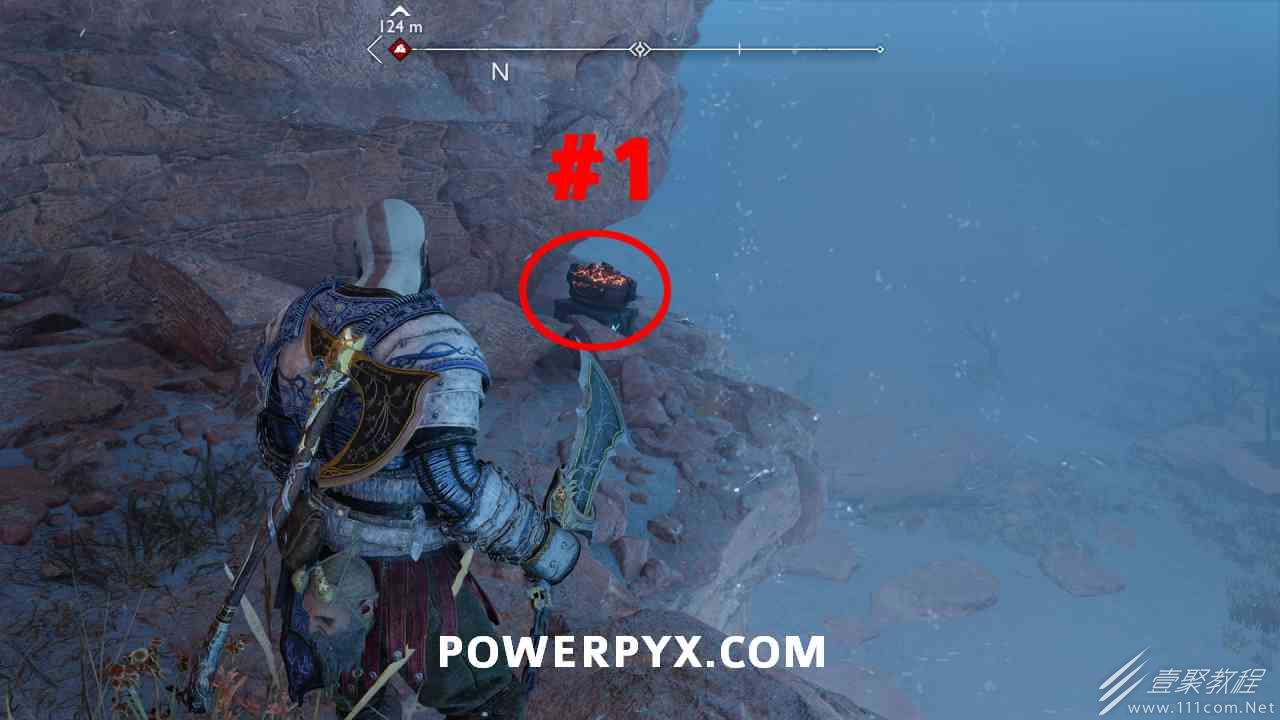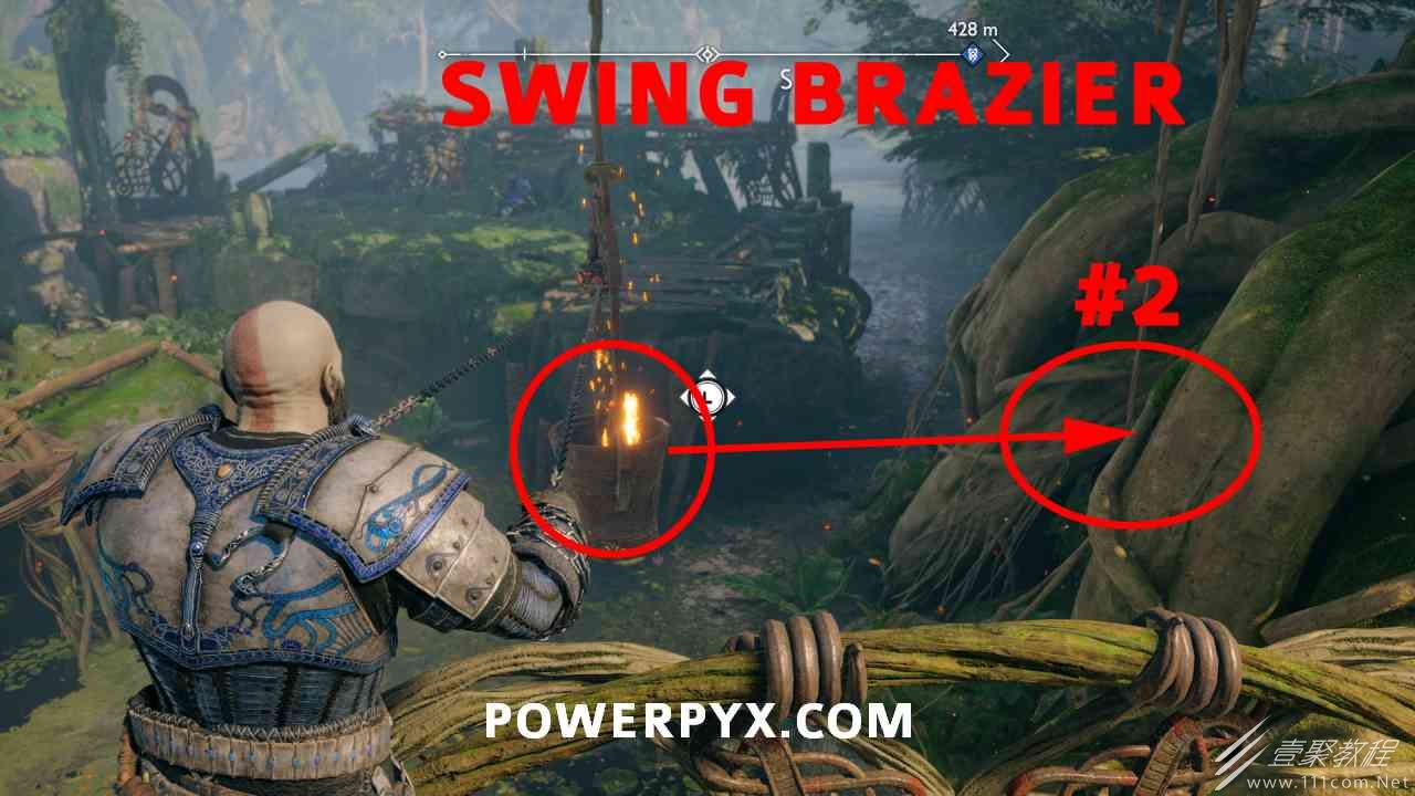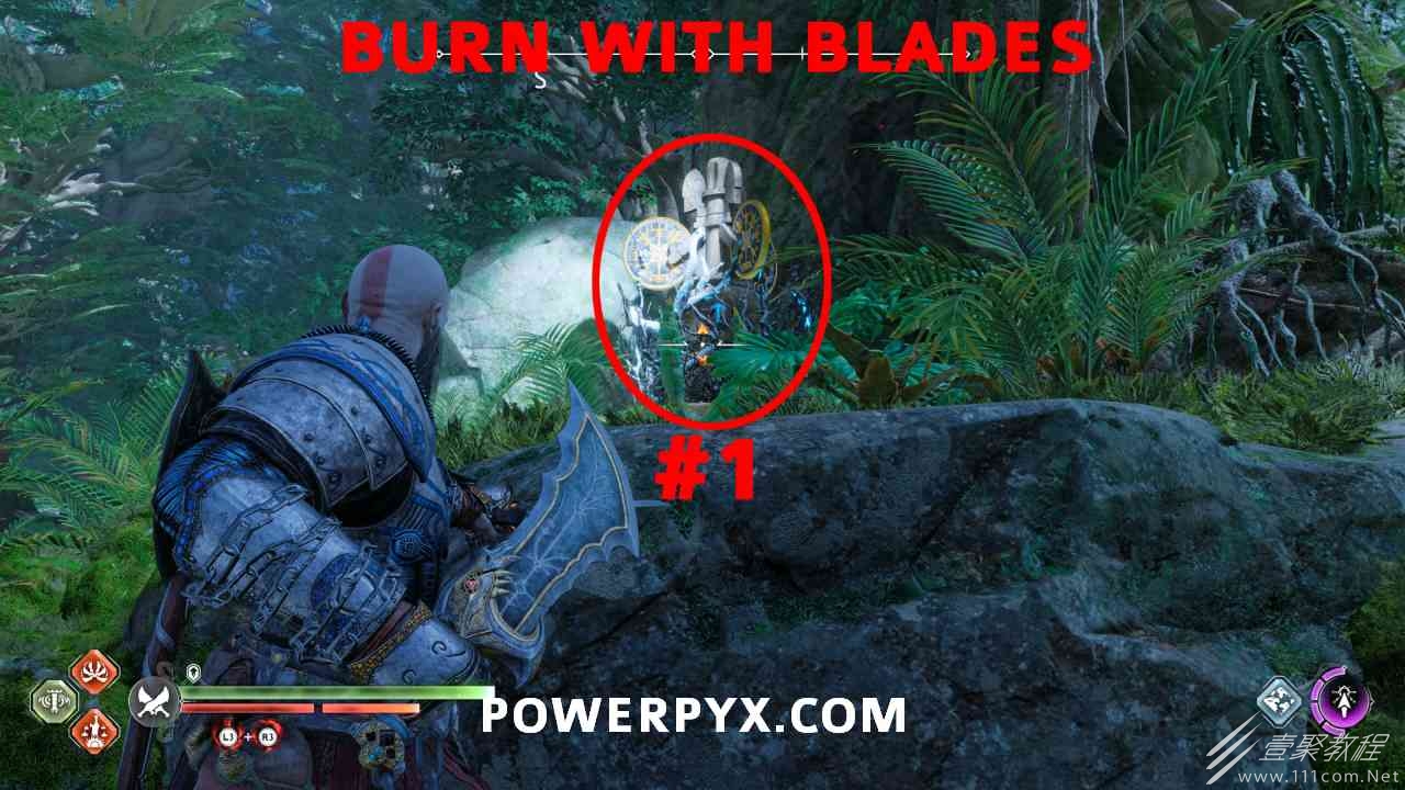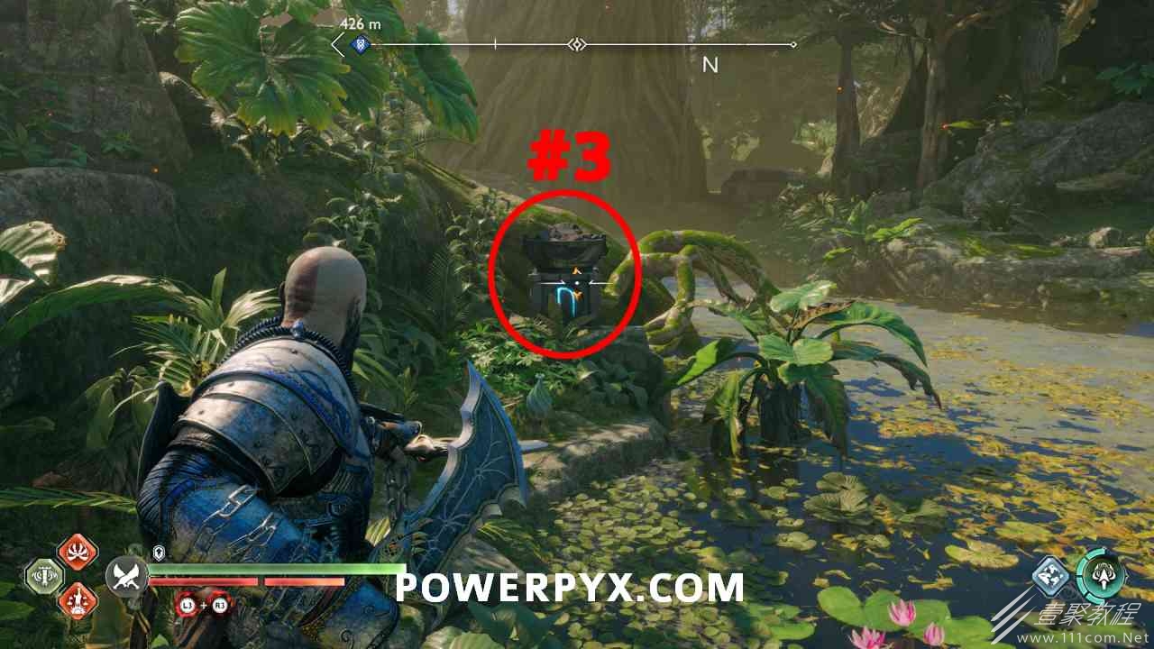 坑 靠近该区域的中心,靠近一个小水车。你必须烧掉 3 个上面有符文的火盆。您可以通过选择混沌之刃并按:l2:+:r2:来执行此操作。第一个在胸部的左边。第二个需要你向左下降,然后使用抓钩跳到第二个火盆。从第二个火盆通过抓钩向后跳,然后第三个火盆在移动的水车下方。您必须通过向上面通道投掷斧头来冻结水,然后才能点燃火盆。当所有 3 个同时点亮时返回宝箱,现在可以打开它。
