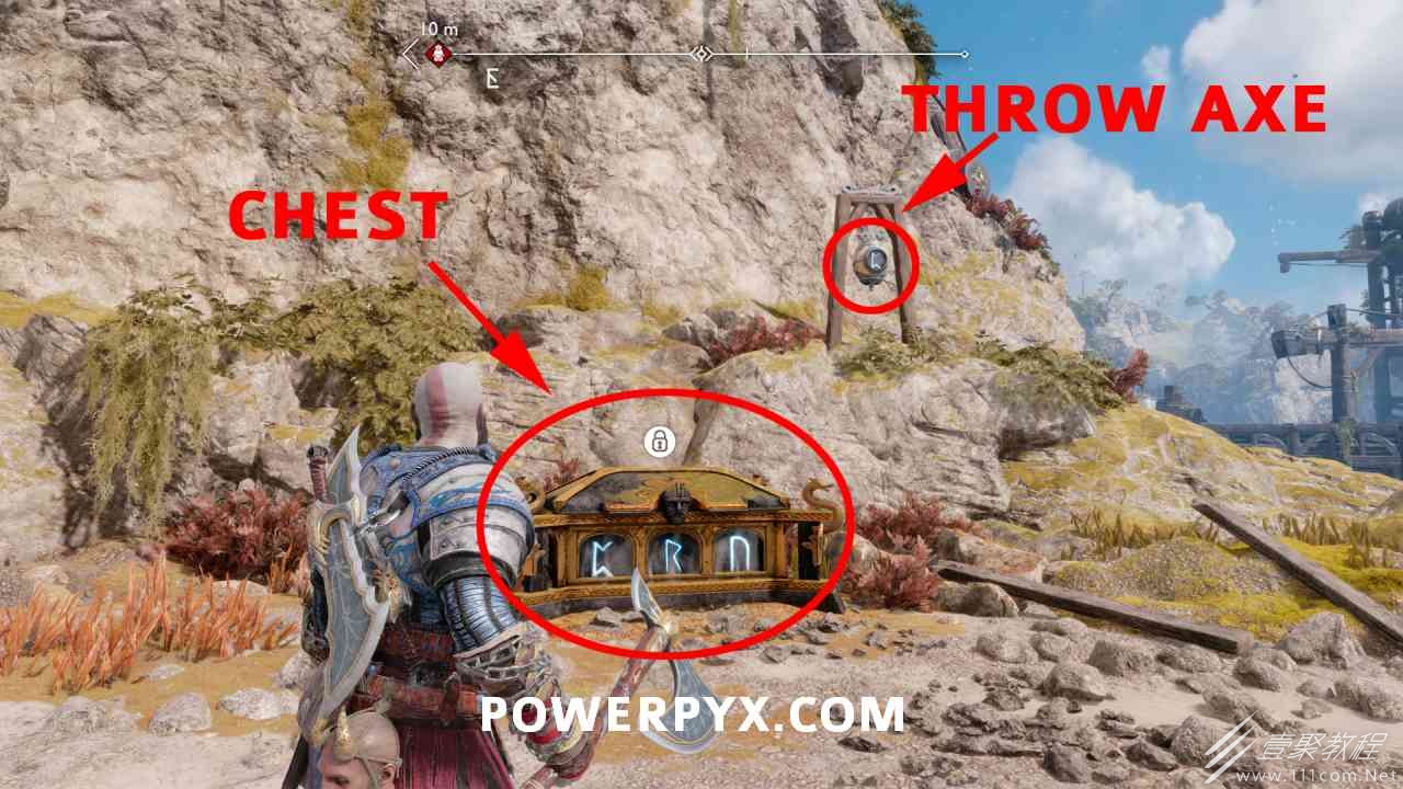 箱子在海滩的左侧。要打开它,您必须摧毁该区域间歇泉后面的 3 个封印图腾。它们很难通过间歇泉看到,所以先把斧头扔到间歇泉上冻结它们,然后你可以看到后面的封印。瞄准它,取回你的斧头:三角形:,然后将斧头扔进间歇泉。第一个是直接在胸部后面。第二个是在海滩右侧的龙雕像后面。第三个位于海滩西侧的间歇泉后面,靠近您可以停靠船只的地方。击中所有 3 个封印后,箱子可以打开。