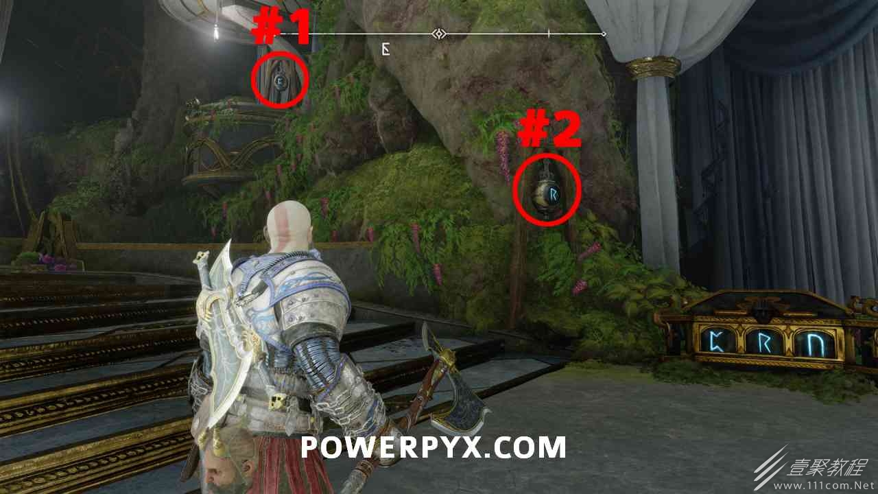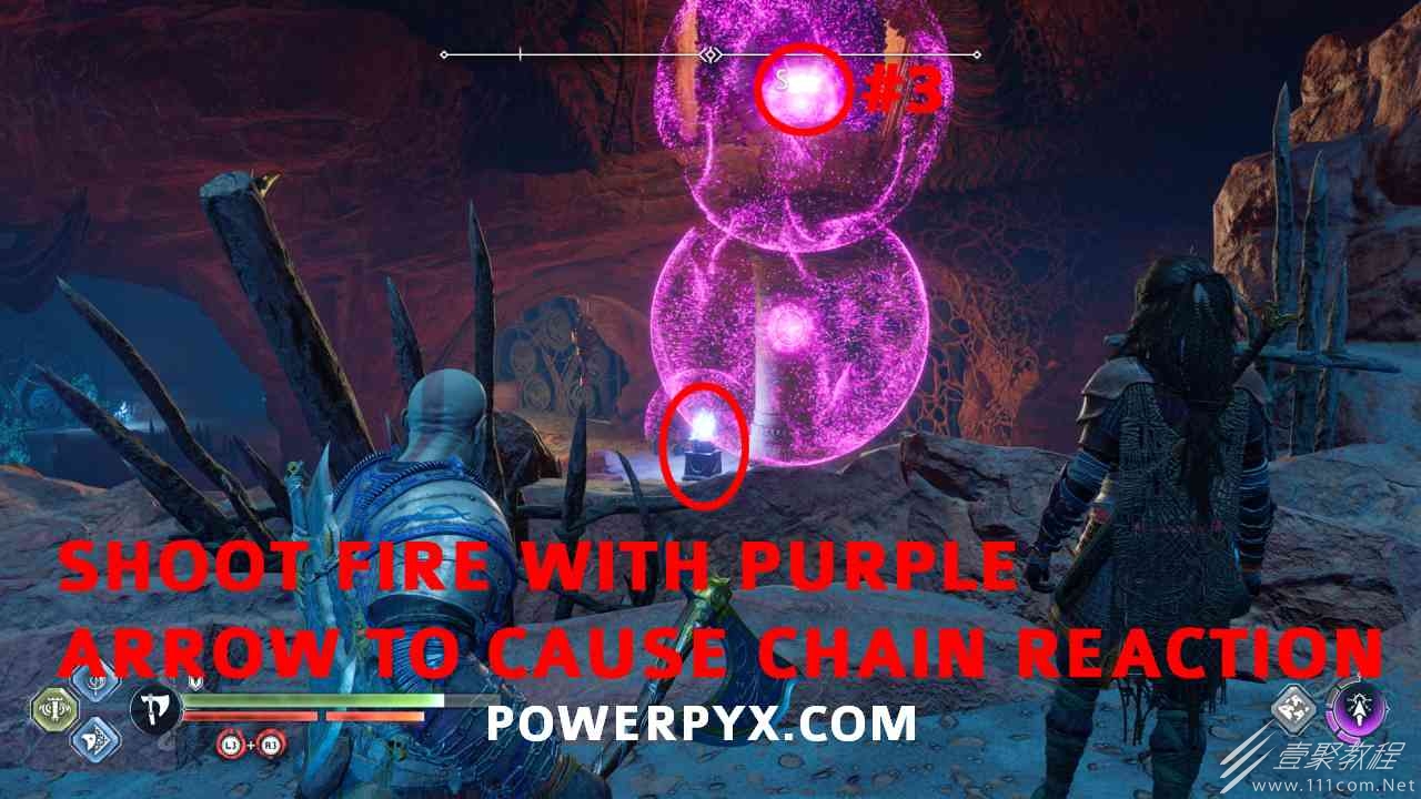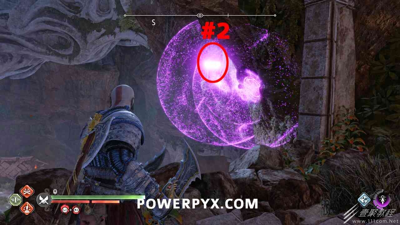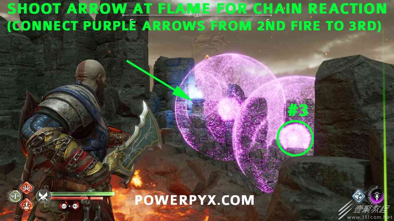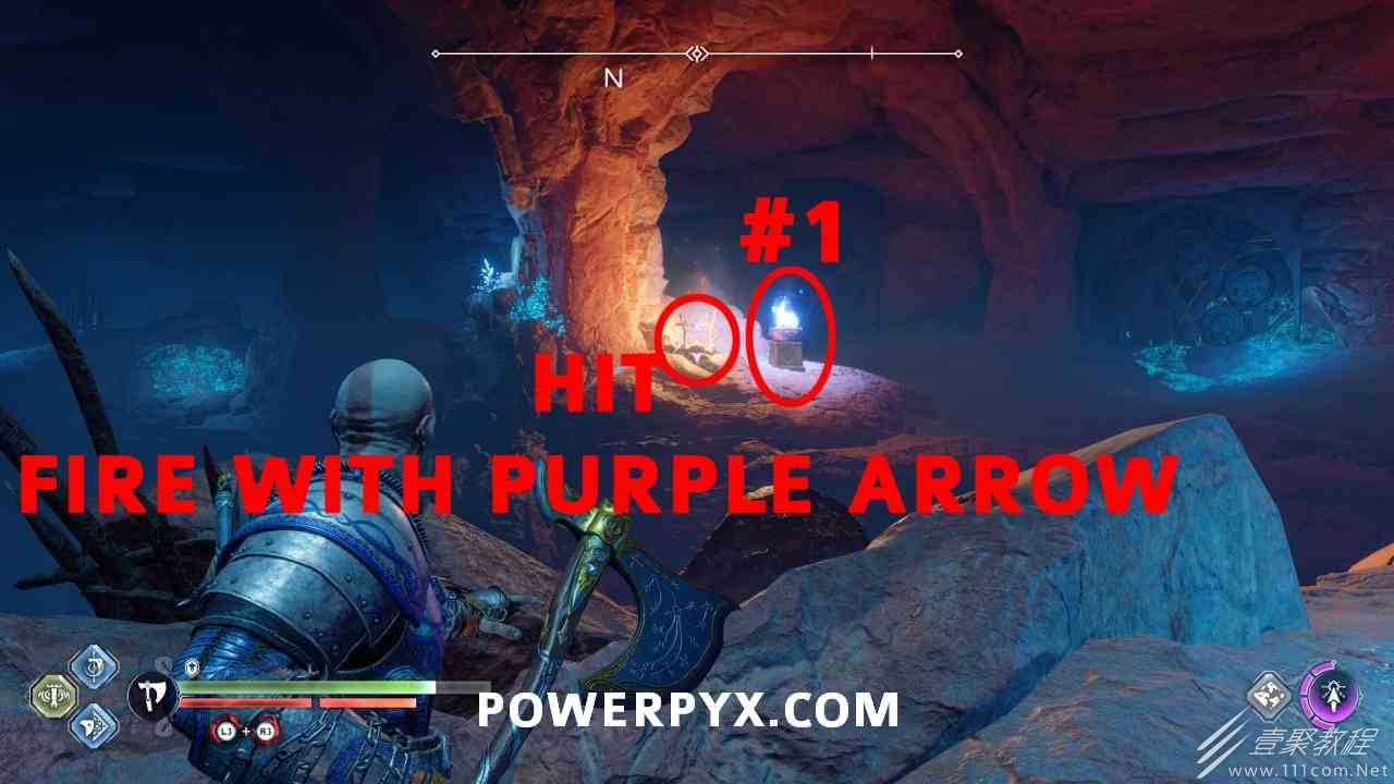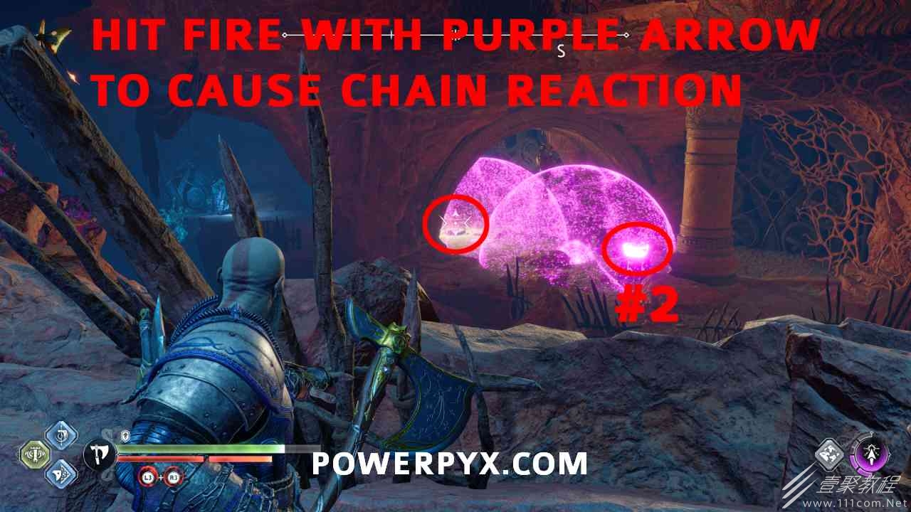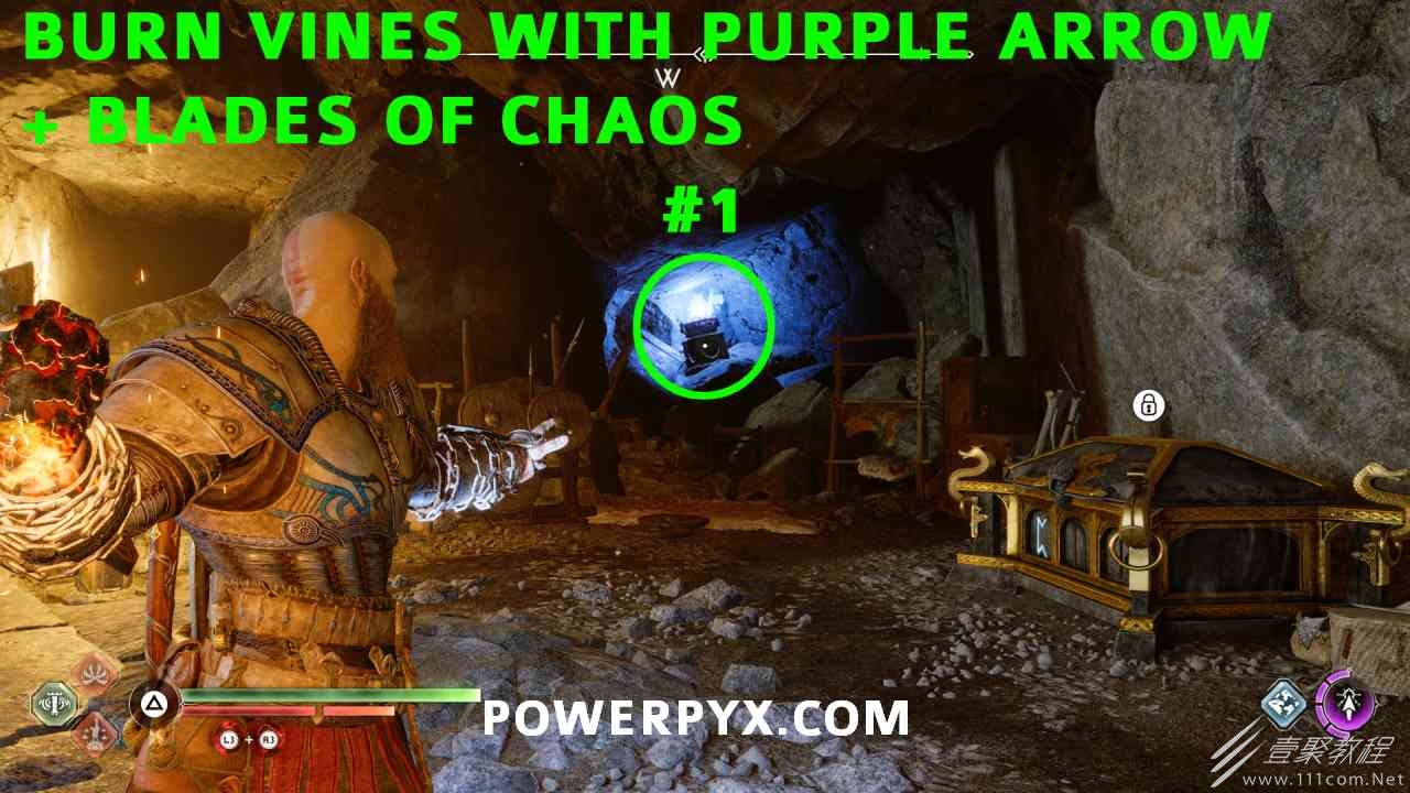 从神秘门户沿着线性路径,直到你挤过一堵墙,然后左转并沿着墙爬。下坡一点后(在遇到阿斯加德遗迹之前),右边有一块黄色发光的岩石。将长矛扔向它炸毁它。后面是胸膛。你必须点燃3个火盆才能打开箱子,使用混沌之刃+:l2::r2:,并放置紫色箭头进行连锁反应。第一个是在胸膛后面,靠近它,在上面使用混沌之刃。第 2 和第 3 个在胸部对面。您必须首先点亮两者的左侧(请参阅标记为#2之前的图像)。要做到这一点,回到你用长矛炸毁黄色发光的岩石的地方,在墙壁上种植 3 支紫色箭头,将其中一个放在足够近的地方,以便你可以用混沌之刃点燃它,从而引起连锁反应,点亮左边的火盆。请记住,您可以(并且应该)在同一点发射多达 3 支紫色箭头以扩大连锁反应的半径。因此,总共使用 9 支箭,在每个位置射击 3 支,让它们覆盖更大的半径,这使您的火力更容易跳到火盆上。第三个火盆在右边,因为它回到了诺尼尔箱。从胸部转身看到火盆#2和#3。您必须在第 2 个和第 3 个火盆之间放置紫色箭头,然后将箭头射入您已经点燃的第二个火盆。如果你在火盆里着火,它会产生一点爆炸,你的紫色箭头会引起连锁反应,将火带到第三个火盆(见下面标有#3的图像)。之后你可以打开箱子。