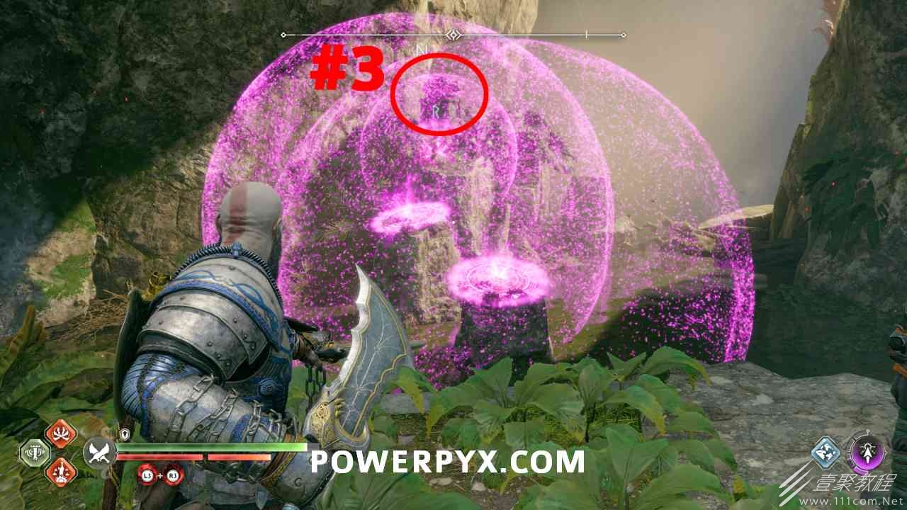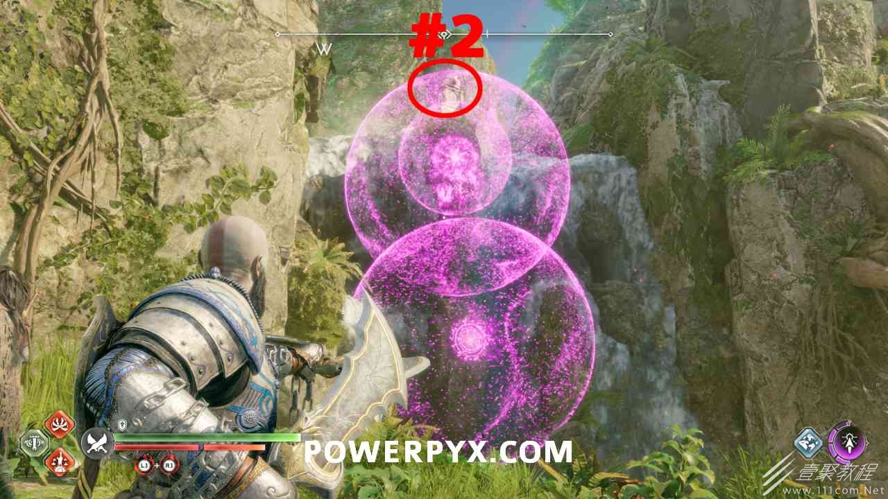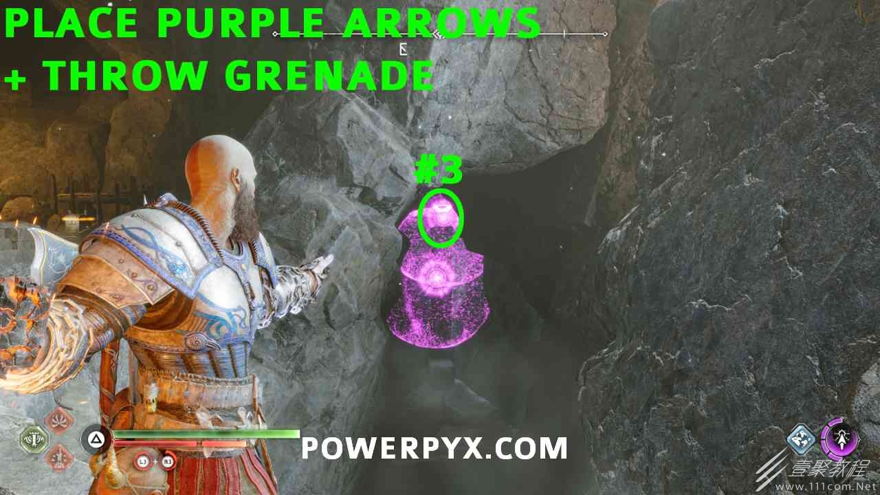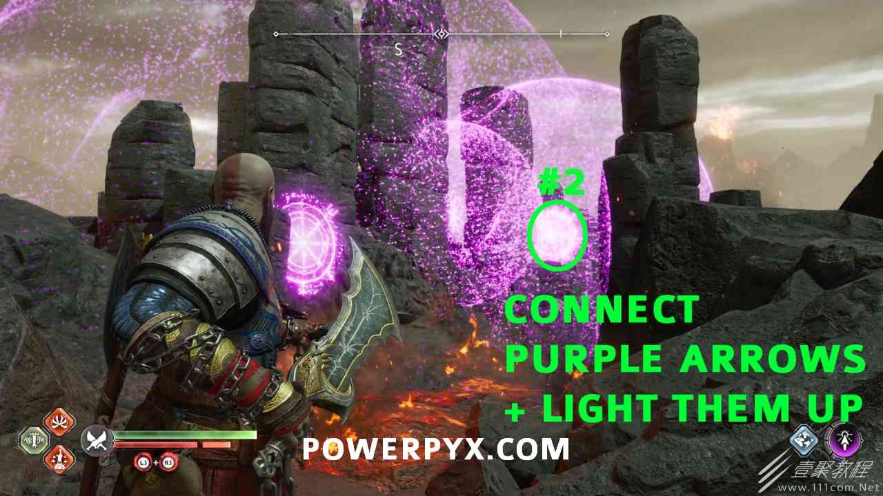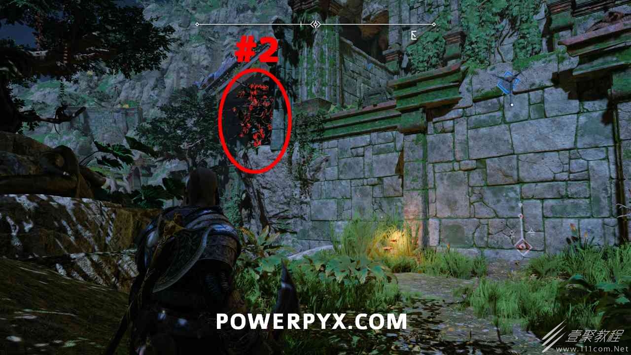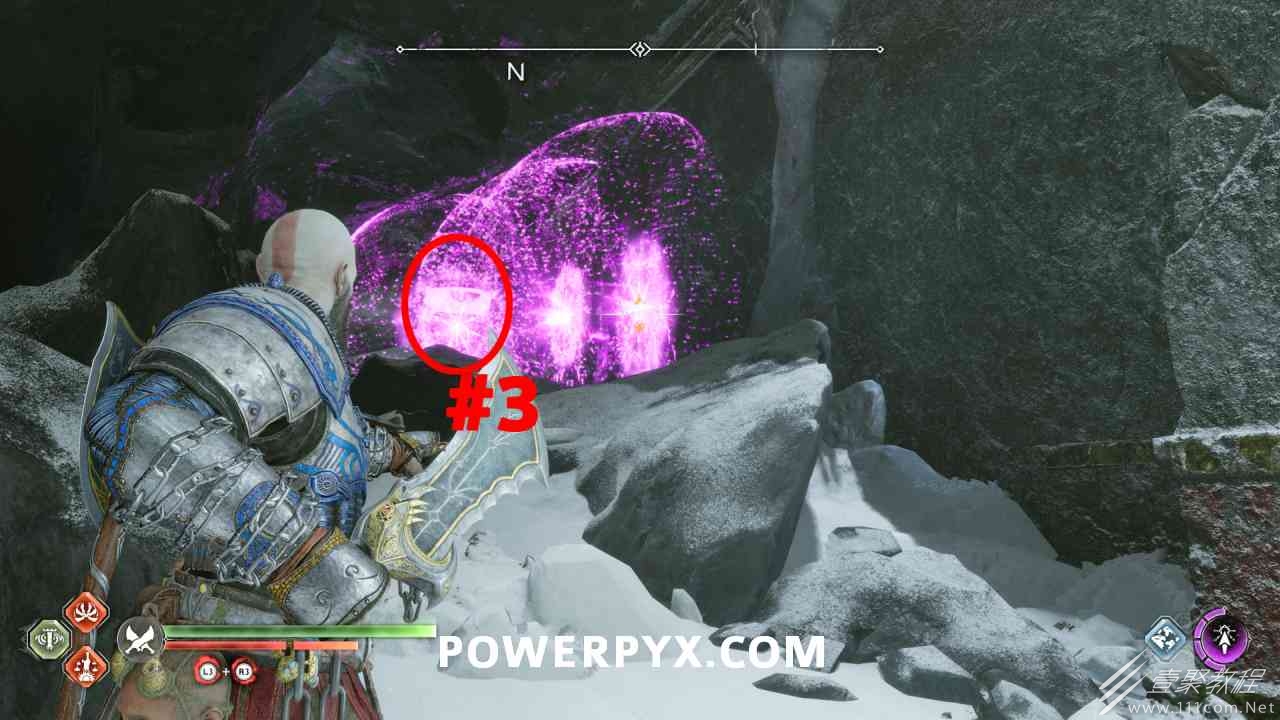 从神秘门户沿着线性路径,直到你挤过一堵墙,然后左转并沿着墙爬。下坡一点后(在遇到阿斯加德遗迹之前),右边有一块黄色发光的岩石。将长矛扔向它炸毁它。后面是胸膛。你必须点燃3个火盆才能打开箱子,使用混沌之刃+:l2::r2:,并放置紫色箭头进行连锁反应。第一个是在胸膛后面,靠近它,在上面使用混沌之刃。第 2 和第 3 个在胸部对面。您必须首先点亮两者的左侧(请参阅标记为#2之前的图像)。要做到这一点,回到你用长矛炸毁黄色发光的岩石的地方,在墙壁上种植 3 支紫色箭头,将其中一个放在足够近的地方,以便你可以用混沌之刃点燃它,从而引起连锁反应,点亮左边的火盆。请记住,您可以(并且应该)在同一点发射多达 3 支紫色箭头以扩大连锁反应的半径。因此,总共使用 9 支箭,在每个位置射击 3 支,让它们覆盖更大的半径,这使您的火力更容易跳到火盆上。第三个火盆在右边,因为它回到了诺尼尔箱。从胸部转身看到火盆#2和#3。您必须在第 2 个和第 3 个火盆之间放置紫色箭头,然后将箭头射入您已经点燃的第二个火盆。如果你在火盆里着火,它会产生一点爆炸,你的紫色箭头会引起连锁反应,将火带到第三个火盆(见下面标有#3的图像)。之后你可以打开箱子。