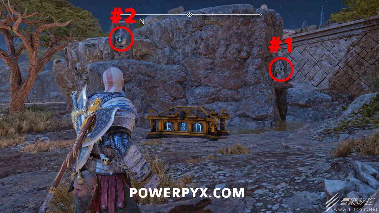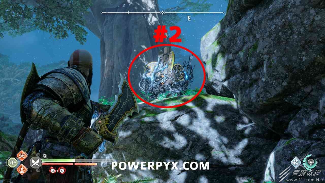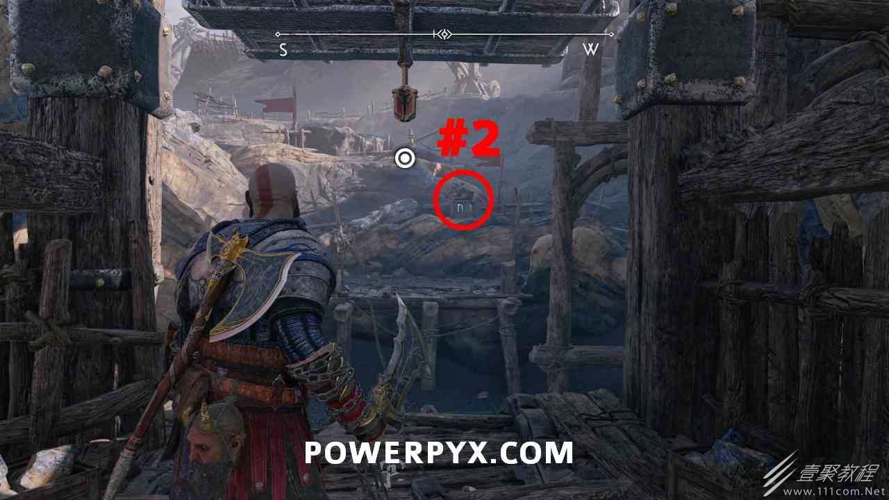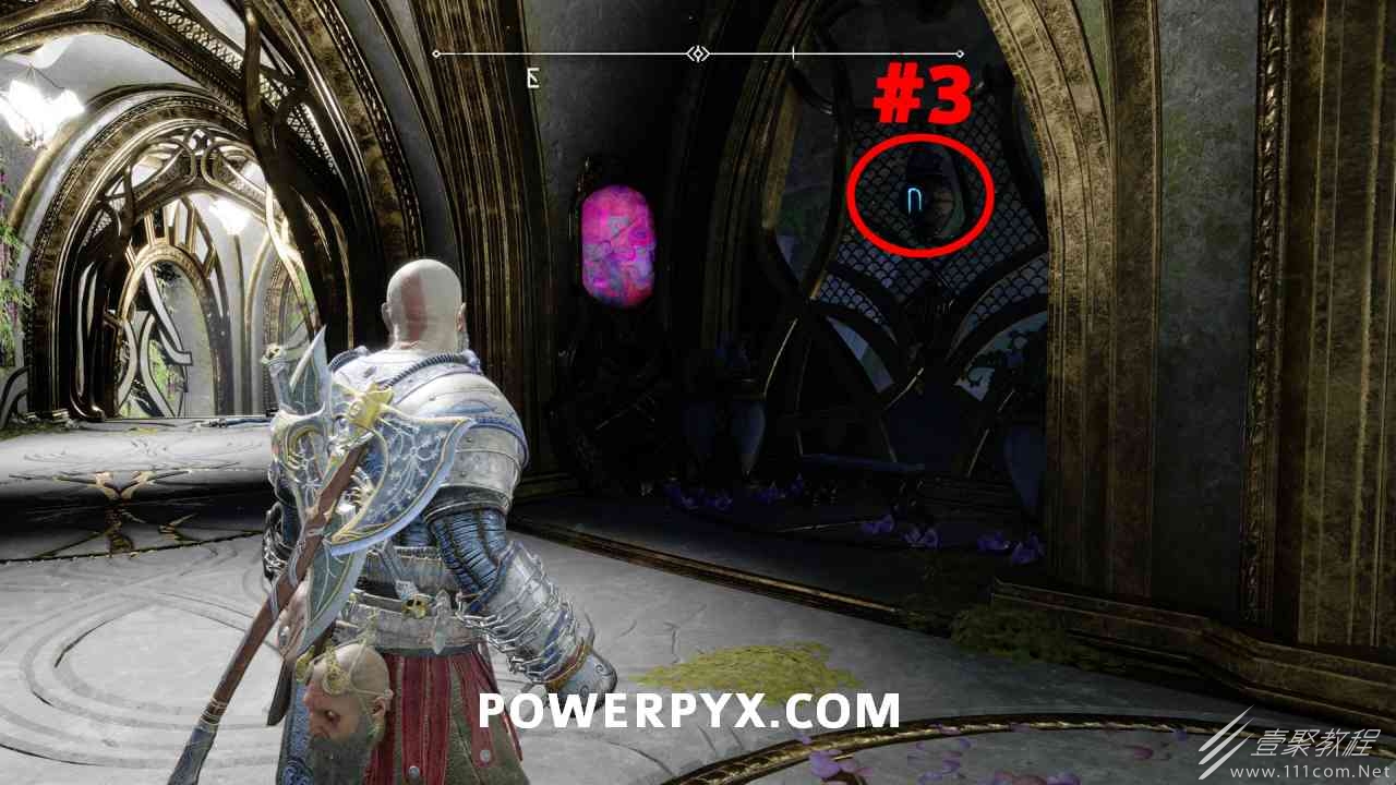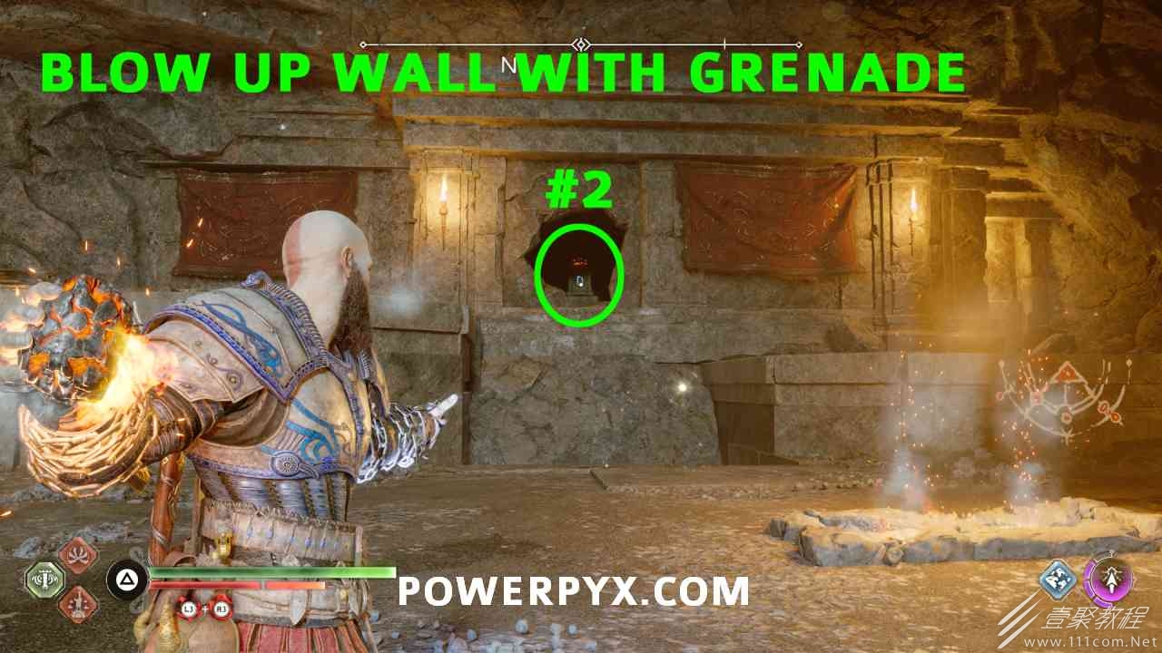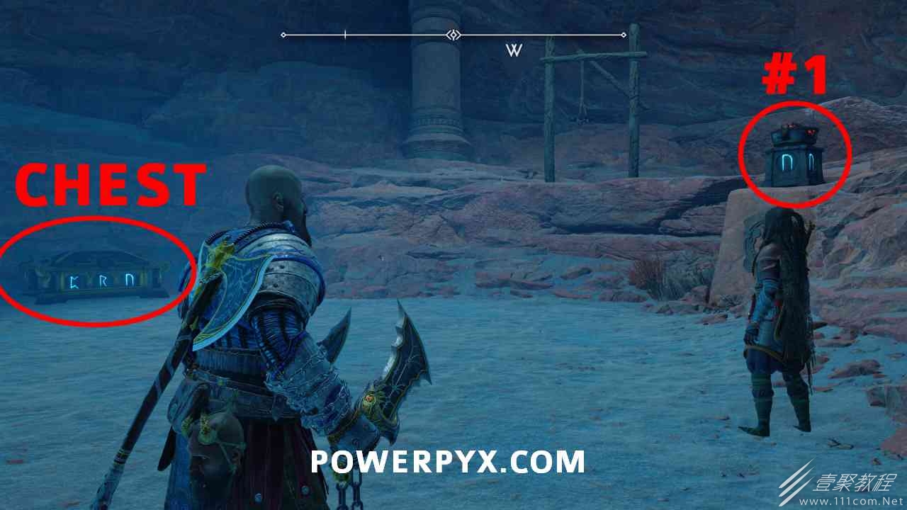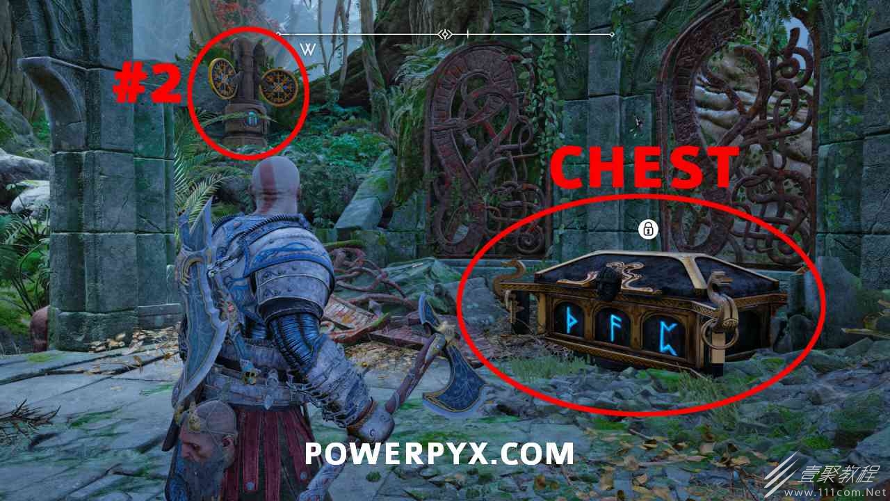 从神秘门户沿着线性路径,直到你挤过一堵墙,然后左转并沿着墙爬。下坡一点后(在遇到阿斯加德遗迹之前),右边有一块黄色发光的岩石。将长矛扔向它炸毁它。后面是胸膛。你必须点燃3个火盆才能打开箱子,使用混沌之刃+:l2::r2:,并放置紫色箭头进行连锁反应。第一个是在胸膛后面,靠近它,在上面使用混沌之刃。第 2 和第 3 个在胸部对面。您必须首先点亮两者的左侧(请参阅标记为#2之前的图像)。要做到这一点,回到你用长矛炸毁黄色发光的岩石的地方,在墙壁上种植 3 支紫色箭头,将其中一个放在足够近的地方,以便你可以用混沌之刃点燃它,从而引起连锁反应,点亮左边的火盆。请记住,您可以(并且应该)在同一点发射多达 3 支紫色箭头以扩大连锁反应的半径。因此,总共使用 9 支箭,在每个位置射击 3 支,让它们覆盖更大的半径,这使您的火力更容易跳到火盆上。第三个火盆在右边,因为它回到了诺尼尔箱。从胸部转身看到火盆#2和#3。您必须在第 2 个和第 3 个火盆之间放置紫色箭头,然后将箭头射入您已经点燃的第二个火盆。如果你在火盆里着火,它会产生一点爆炸,你的紫色箭头会引起连锁反应,将火带到第三个火盆(见下面标有#3的图像)。之后你可以打开箱子。