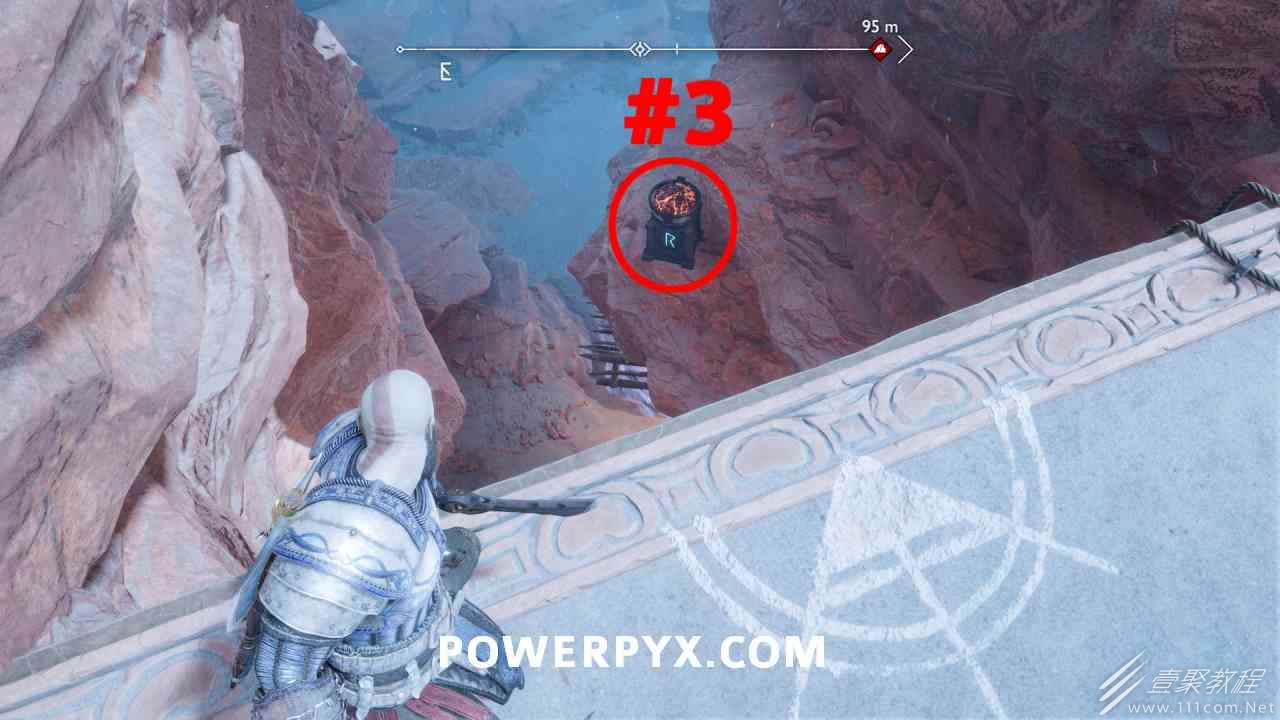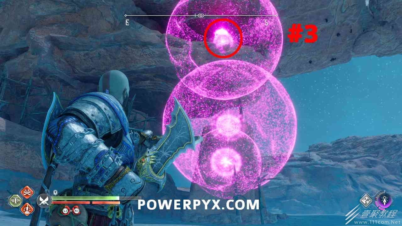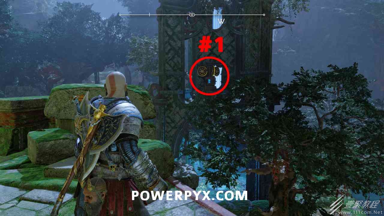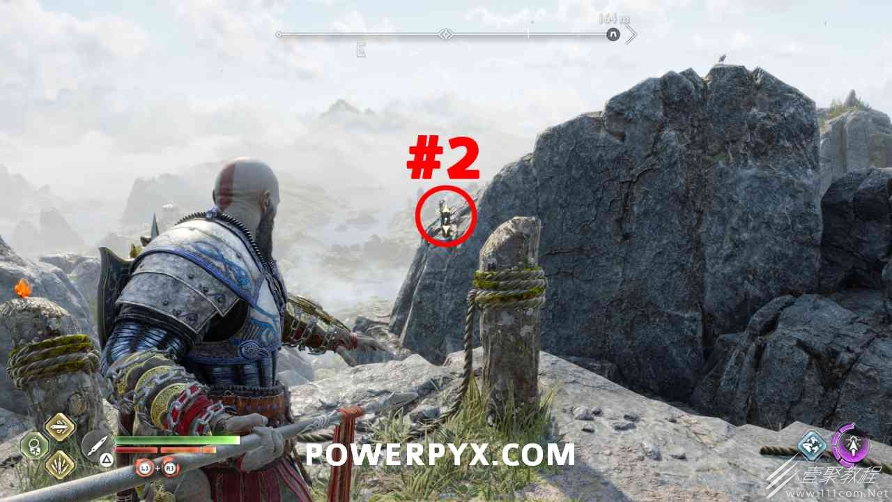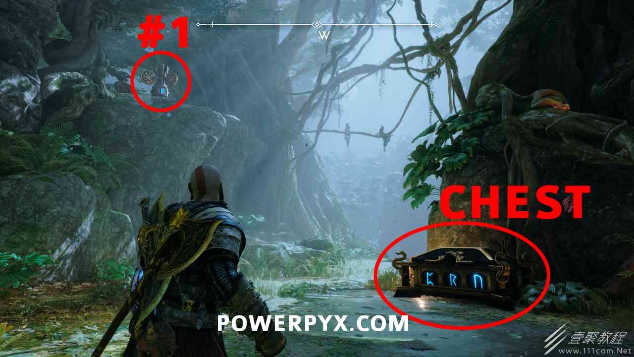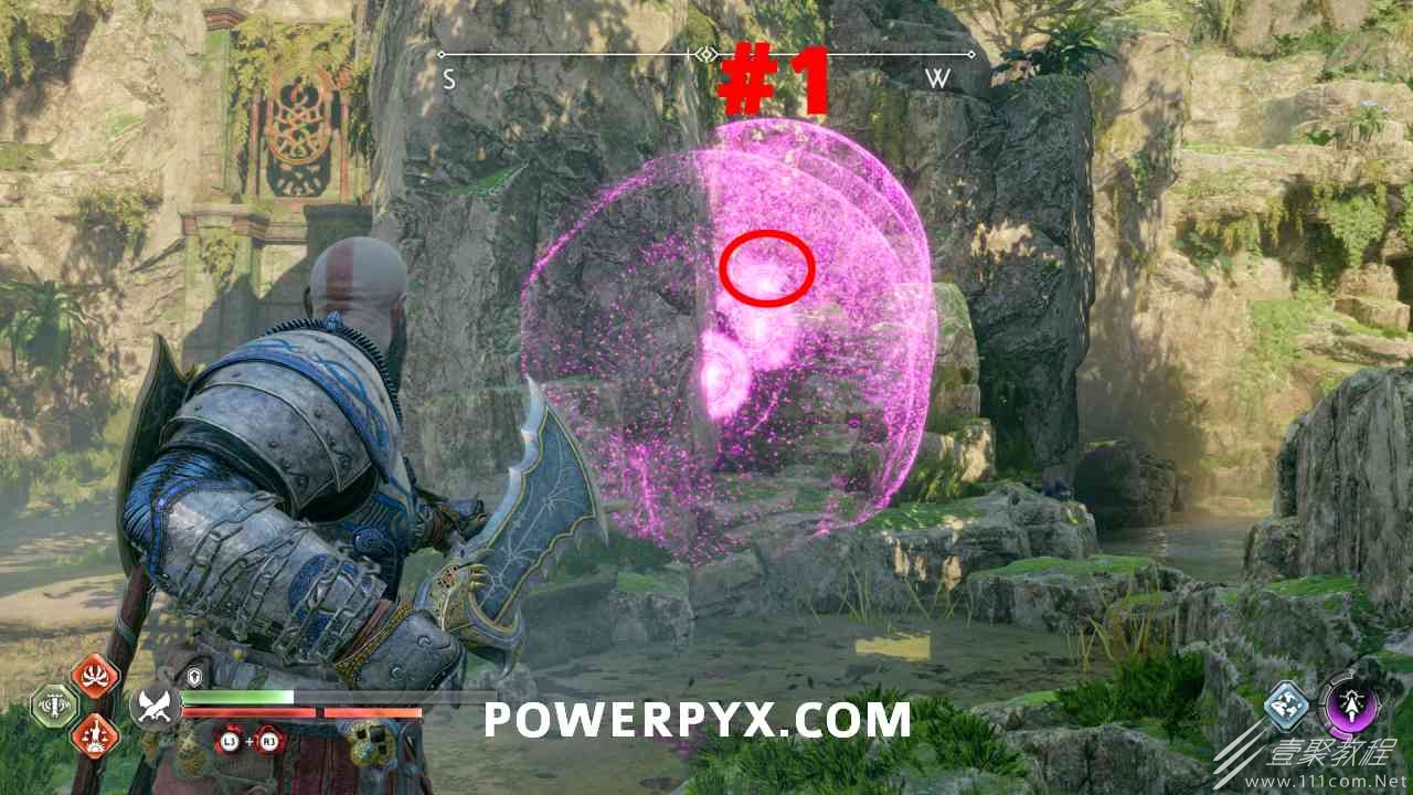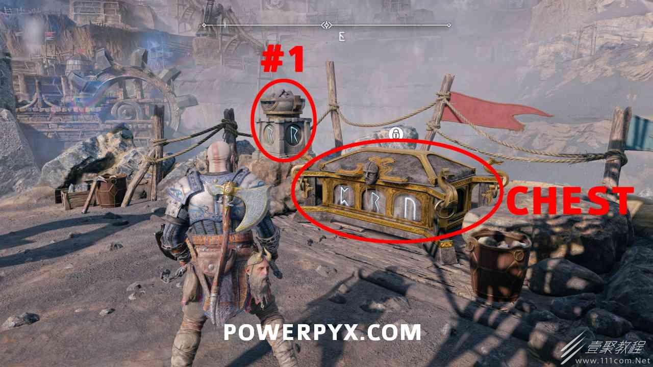 从神秘门户沿着线性路径,直到你挤过一堵墙,然后左转并沿着墙爬。下坡一点后(在遇到阿斯加德遗迹之前),右边有一块黄色发光的岩石。将长矛扔向它炸毁它。后面是胸膛。你必须点燃3个火盆才能打开箱子,使用混沌之刃+:l2::r2:,并放置紫色箭头进行连锁反应。第一个是在胸膛后面,靠近它,在上面使用混沌之刃。第 2 和第 3 个在胸部对面。您必须首先点亮两者的左侧(请参阅标记为#2之前的图像)。要做到这一点,回到你用长矛炸毁黄色发光的岩石的地方,在墙壁上种植 3 支紫色箭头,将其中一个放在足够近的地方,以便你可以用混沌之刃点燃它,从而引起连锁反应,点亮左边的火盆。请记住,您可以(并且应该)在同一点发射多达 3 支紫色箭头以扩大连锁反应的半径。因此,总共使用 9 支箭,在每个位置射击 3 支,让它们覆盖更大的半径,这使您的火力更容易跳到火盆上。第三个火盆在右边,因为它回到了诺尼尔箱。从胸部转身看到火盆#2和#3。您必须在第 2 个和第 3 个火盆之间放置紫色箭头,然后将箭头射入您已经点燃的第二个火盆。如果你在火盆里着火,它会产生一点爆炸,你的紫色箭头会引起连锁反应,将火带到第三个火盆(见下面标有#3的图像)。之后你可以打开箱子。