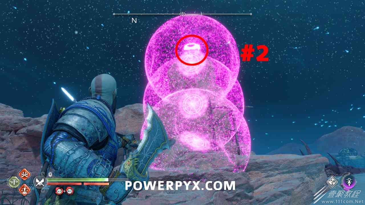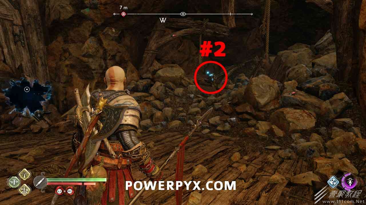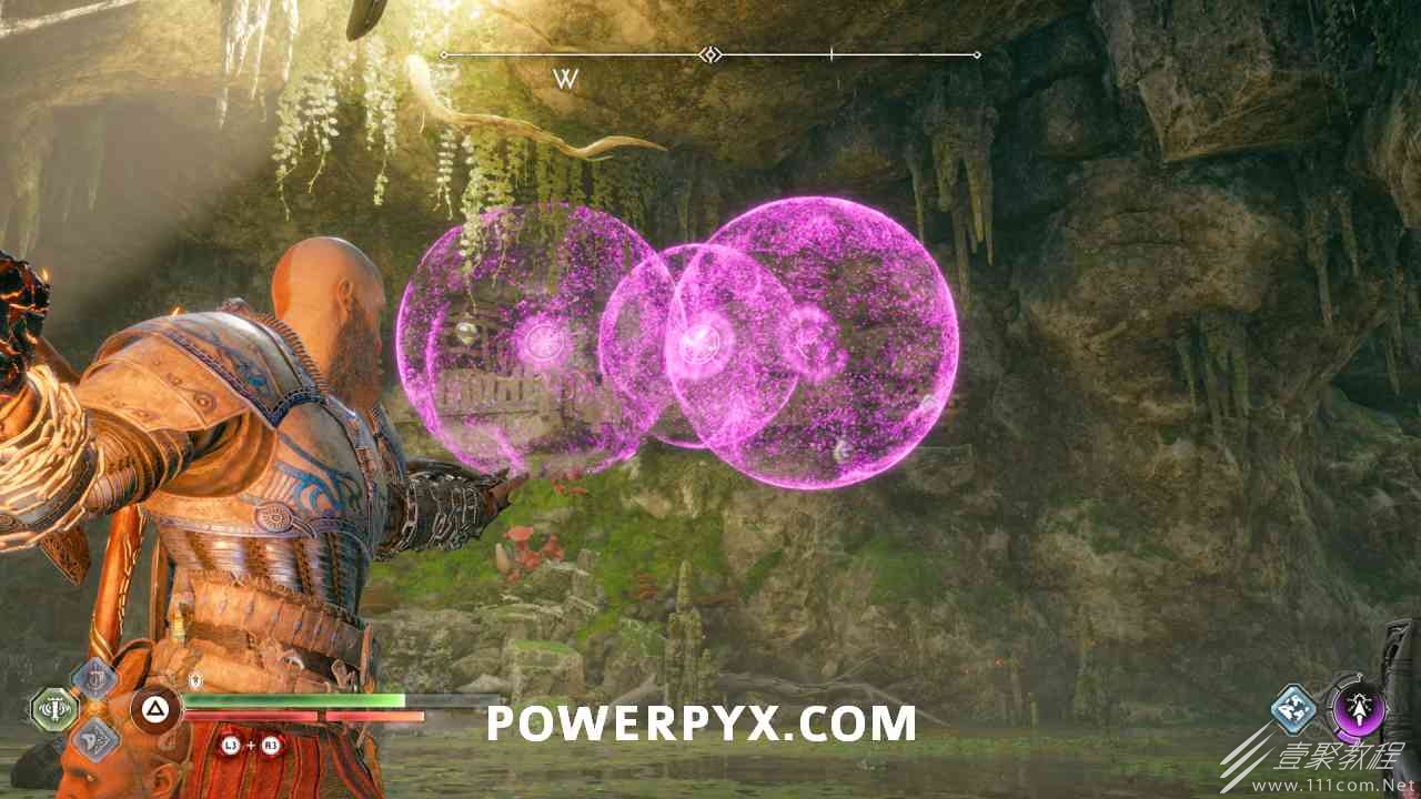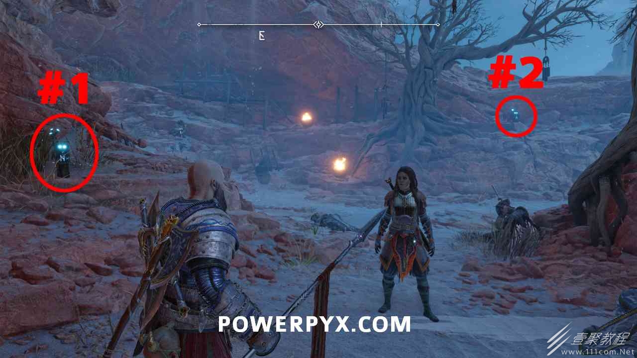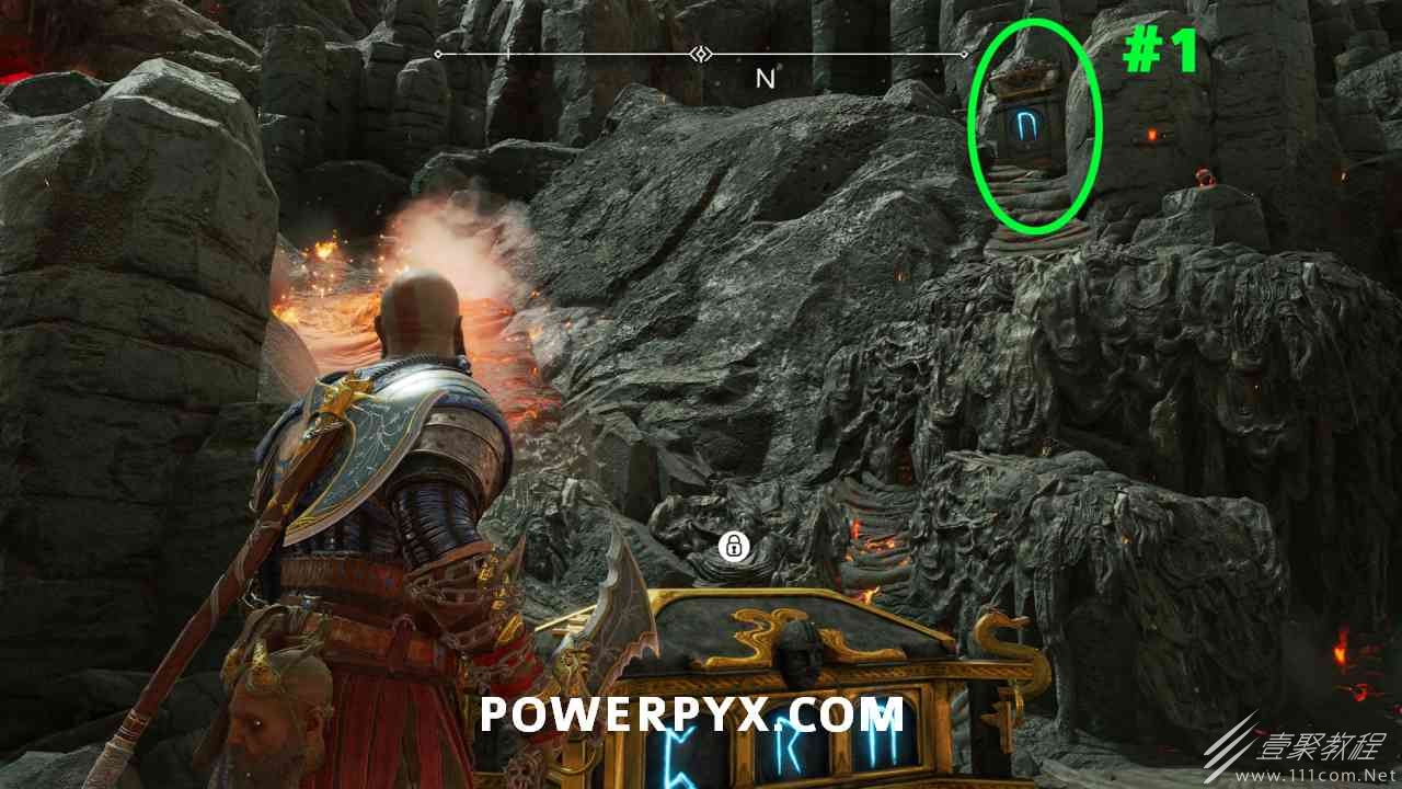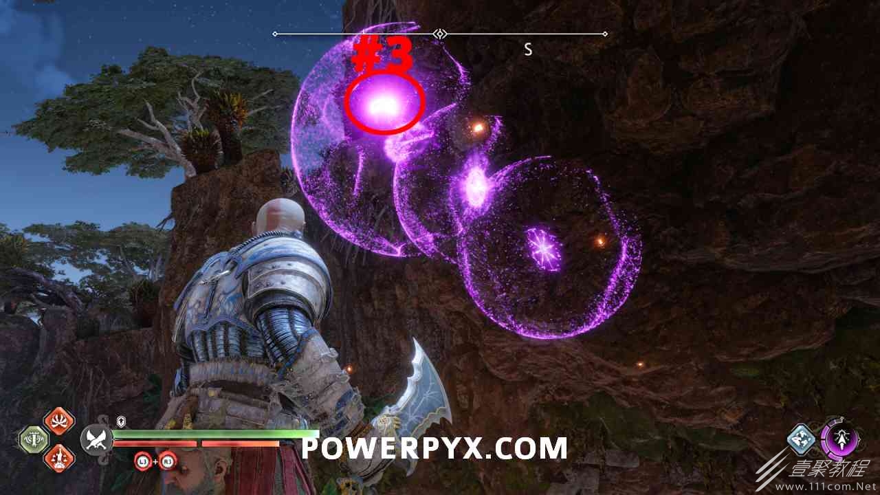 从神秘门户沿着线性路径,直到你挤过一堵墙,然后左转并沿着墙爬。下坡一点后(在遇到阿斯加德遗迹之前),右边有一块黄色发光的岩石。将长矛扔向它炸毁它。后面是胸膛。你必须点燃3个火盆才能打开箱子,使用混沌之刃+:l2::r2:,并放置紫色箭头进行连锁反应。第一个是在胸膛后面,靠近它,在上面使用混沌之刃。第 2 和第 3 个在胸部对面。您必须首先点亮两者的左侧(请参阅标记为#2之前的图像)。要做到这一点,回到你用长矛炸毁黄色发光的岩石的地方,在墙壁上种植 3 支紫色箭头,将其中一个放在足够近的地方,以便你可以用混沌之刃点燃它,从而引起连锁反应,点亮左边的火盆。请记住,您可以(并且应该)在同一点发射多达 3 支紫色箭头以扩大连锁反应的半径。因此,总共使用 9 支箭,在每个位置射击 3 支,让它们覆盖更大的半径,这使您的火力更容易跳到火盆上。第三个火盆在右边,因为它回到了诺尼尔箱。从胸部转身看到火盆#2和#3。您必须在第 2 个和第 3 个火盆之间放置紫色箭头,然后将箭头射入您已经点燃的第二个火盆。如果你在火盆里着火,它会产生一点爆炸,你的紫色箭头会引起连锁反应,将火带到第三个火盆(见下面标有#3的图像)。之后你可以打开箱子。