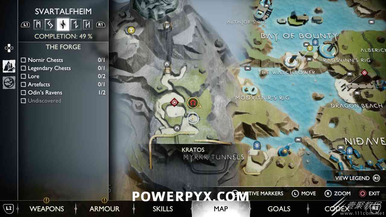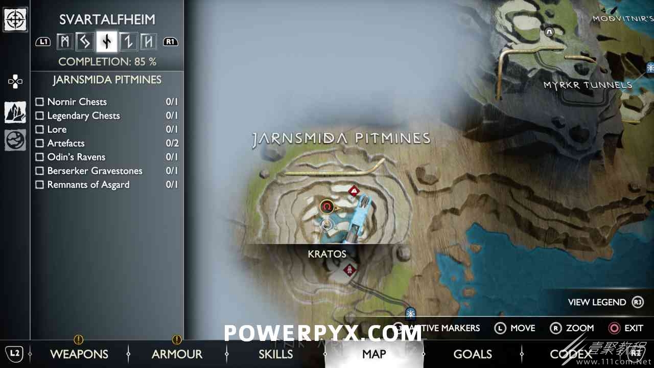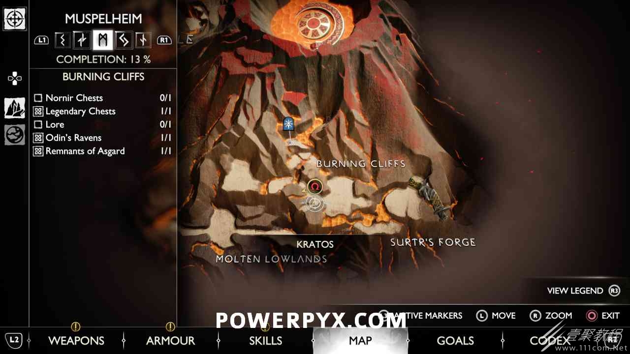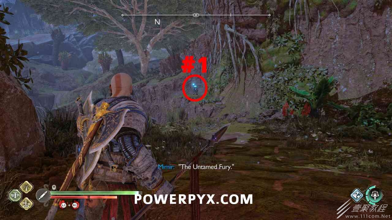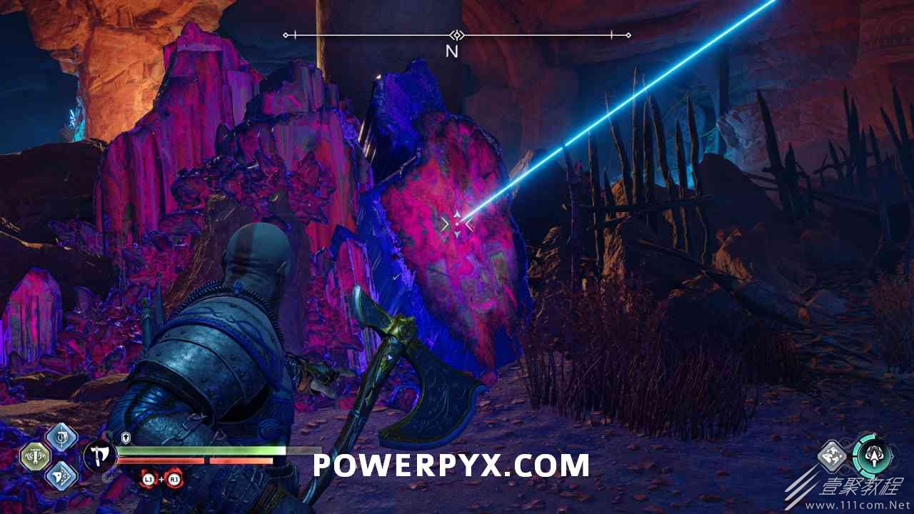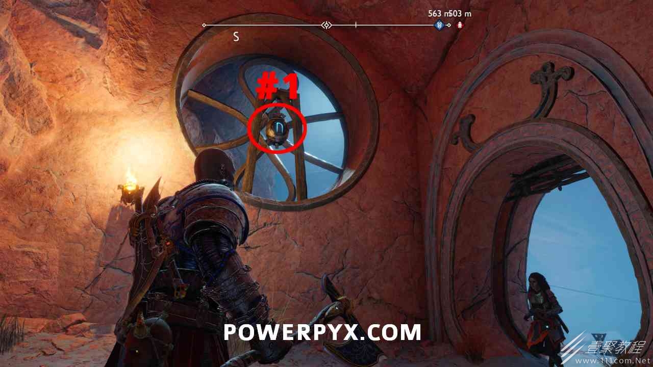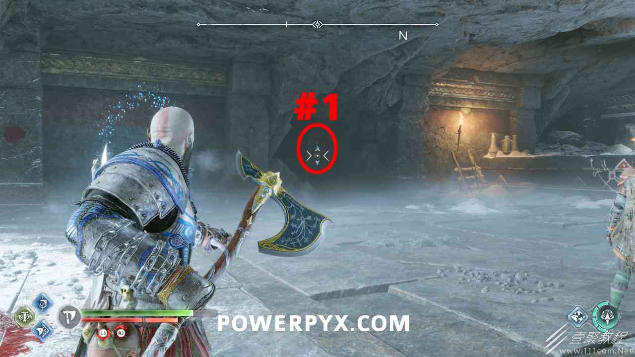 从神秘门户沿着线性路径,直到你挤过一堵墙,然后左转并沿着墙爬。下坡一点后(在遇到阿斯加德遗迹之前),右边有一块黄色发光的岩石。将长矛扔向它炸毁它。后面是胸膛。你必须点燃3个火盆才能打开箱子,使用混沌之刃+:l2::r2:,并放置紫色箭头进行连锁反应。第一个是在胸膛后面,靠近它,在上面使用混沌之刃。第 2 和第 3 个在胸部对面。您必须首先点亮两者的左侧(请参阅标记为#2之前的图像)。要做到这一点,回到你用长矛炸毁黄色发光的岩石的地方,在墙壁上种植 3 支紫色箭头,将其中一个放在足够近的地方,以便你可以用混沌之刃点燃它,从而引起连锁反应,点亮左边的火盆。请记住,您可以(并且应该)在同一点发射多达 3 支紫色箭头以扩大连锁反应的半径。因此,总共使用 9 支箭,在每个位置射击 3 支,让它们覆盖更大的半径,这使您的火力更容易跳到火盆上。第三个火盆在右边,因为它回到了诺尼尔箱。从胸部转身看到火盆#2和#3。您必须在第 2 个和第 3 个火盆之间放置紫色箭头,然后将箭头射入您已经点燃的第二个火盆。如果你在火盆里着火,它会产生一点爆炸,你的紫色箭头会引起连锁反应,将火带到第三个火盆(见下面标有#3的图像)。之后你可以打开箱子。