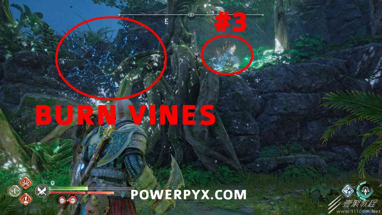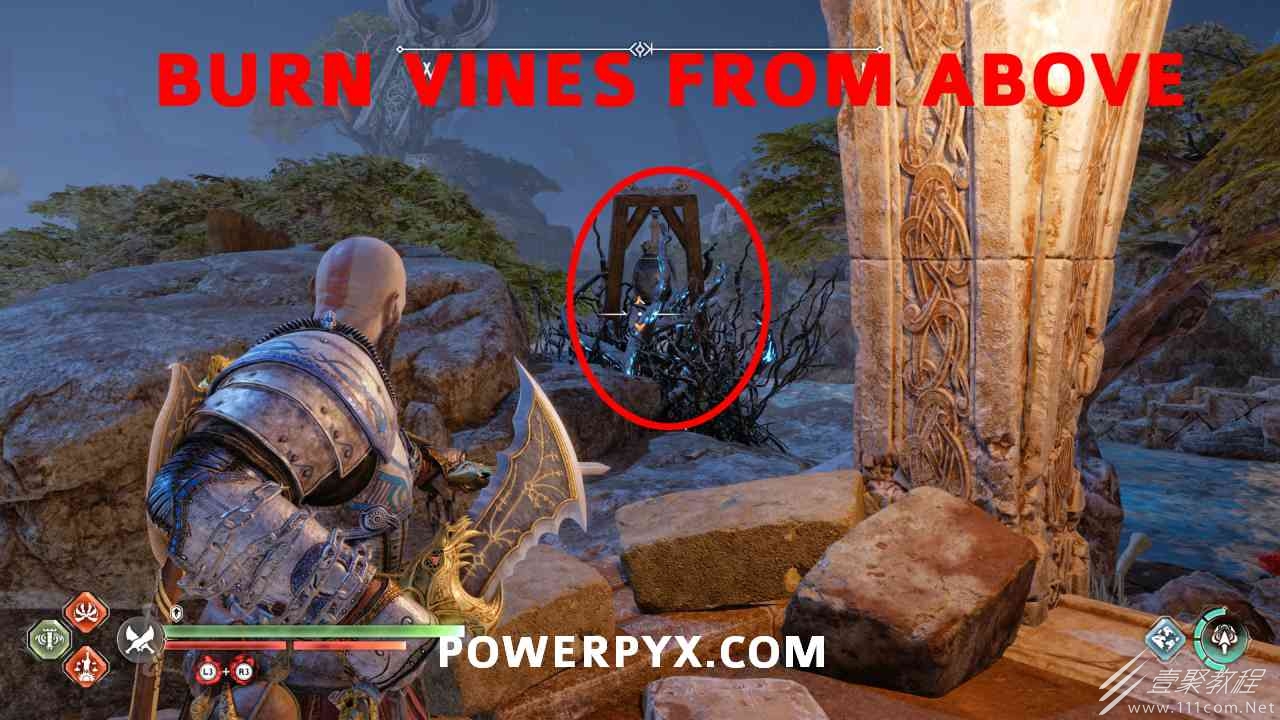继续沿着线性路径前进,您将到达诺尼尔箱,在主要路径中间的明显视线中,不能错过它。您必须通过向它们投掷斧头来转动 3 个符号。第一个在左侧胸部上方。第二个在箱子的右边,必须先用混沌之刃:l2:(+)烧毁藤蔓:r2:。第三个是胸口对面,必须烧掉垂在窗台上的藤蔓,火势会蔓延,然后就可以扔斧头转动符号了。当你把符号变成正确的符号时,你会看到那个符号的光在诺尼尔宝箱本身上熄灭了。然后可以打开箱子。