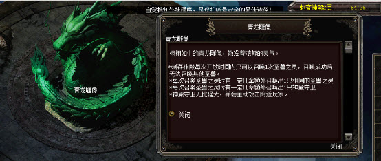 拥有令牌的玩家可以在刺客神殿2层的雕像处,召唤青龙之灵、朱雀之灵、白虎之灵和玄武之灵四大圣兽BOSS进行挑战,单次副本只能挑战一只圣兽无法重复召唤。另外,玩家每次召唤圣兽之灵时,将有30%几率额外召唤出1个相同的圣兽之灵(双倍奖励),同时,有50%30%几率召唤出一个神殿守卫(无敌,秒杀),机遇与挑战并存。