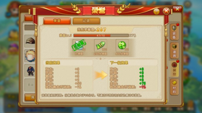 荣誉值达到一定积分后荣誉等级也会提升,玩家可以领取由荣誉系统所提供的奖励,每一等级的荣誉都会给玩家带来效果提升,根据不同荣誉等级提升不同的效果。