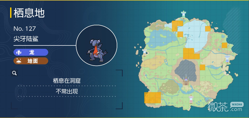 尖牙陆鲨是龙和地面属性的宝可梦,想要抓尖牙陆鲨可以去地图北部霜抹山和西南方向的焙固镇附近的洞窟里面找,具体分布区域如下图。