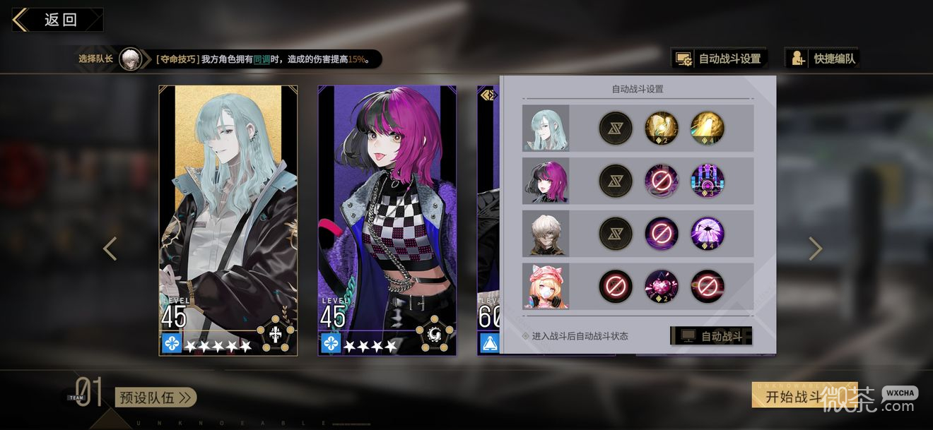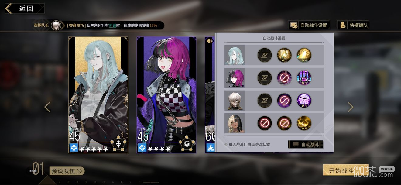 注意一个细节,我把丧钟的单体技能禁了,因为前期伤害不够,aoe秒不掉对面,单体技能开着会影响下一次开aoe!!!!像我这样自动设置,可以保证丧钟吃到弦的第二个灵纹解放并且开出第二次奥义清场!