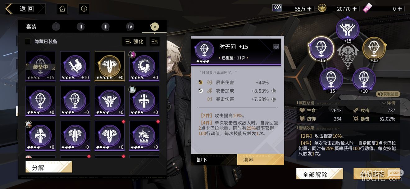 同时,此时剥皮匠已经不太合适了,因为丧钟需要大量4豆开奥义打输出。这时候需要去刷一下时无间套,把攻击,暴击,爆伤三个位置强化到+10(商城有2000个强化材料可以金币购买),稍微洗一洗攻击加成词条,爆伤词条,暴击稍微低点没事,同调队不差暴击,纹章不用强求金色,紫色够用了。加攻,加豆,加回合!配上丧钟的专武,一波下来加4个豆!根本不差能量!!!