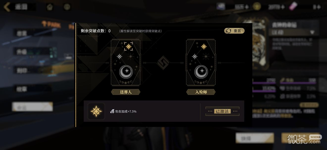 之后把打到的专武强化一下,可以突破一次,推荐左边的7.5%攻击,虽然只能强化到20级,但是加攻击很实在。
