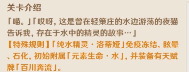 1张召唤类型原魔卡强度尚好,在这一挑战中会出现一个特殊规则,实际上就像我们通常大世界中打水元素生物体一样免疫冻结,眩晕,石化,并初始吸附水元素,对水伤免疫。