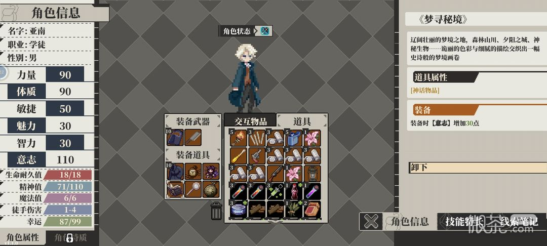 获取:到校园大门再去右上角会发现两个NPC交谈过去会触发一段剧情,剧情过后去和留下的NPC互动借钱给他,(然后这时可以干些别的可以去掏拉圾桶侦查成功可以获得另一个超凡物品的道具。)然后再去同样的右上角再触发一次剧情再过去帮他修好人偶,(剧情后要稍等一会可以去电话亭去打电话,只要你没一直孤独一掷幸运一般都能过,观察电话便签打第二个电话可以到时侯去车行买武器点击武器商人可以和他议价或卖酒精)再去触发最后一次剧情他就会将人偶给你。