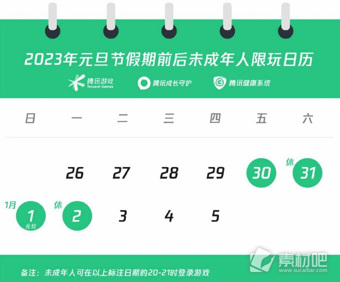 结合《关于进一步严格管理 切实防止未成年人沉迷网络游戏的通知》与实际放假安排,2023年元旦假期前后,腾讯游戏旗下在中国大陆地区运营的网络游戏面向未成年人的游戏限玩执行如下: