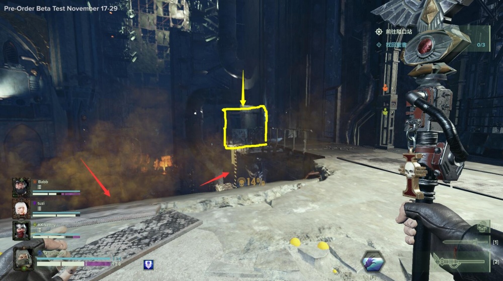 从左边红箭头跳下平台时(不是具体位置,就是说这底下有平台),纳垢巨兽的寻路会翻过黄色箭头处的铁丝网向里面走。此时你再从右边红箭头的梯子处爬上来,纳垢巨兽还会翻一次铁丝网,如此往复,无伤解决。