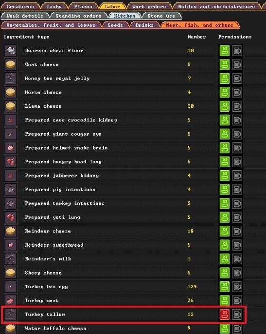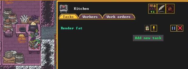 接着你需要在厨房里将屠宰动物获得的肥肉(fat)提炼成兽脂(tallow),兽脂应该也是液体。我个人建议在工作计划里设置成每天检测有肥肉就提炼。