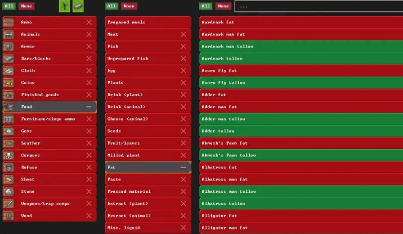 因此建议区分存放,储存区域里兽脂和肥肉都在fat一栏里,如果没有特别指定,简单方法是先全选fat下的所有内容,再检索fat或者tallow,禁止该项,就会获得有另一项的储存区域。