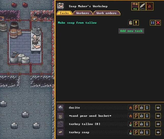这里需要注意在厨房的加工列表里把使用兽脂制作熟食的选项关掉,不然熬出来的兽脂很可能没到肥皂工匠手上就被厨房用了。
