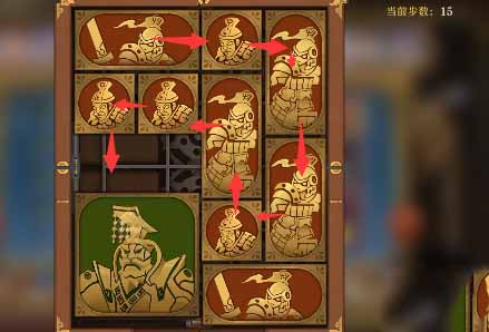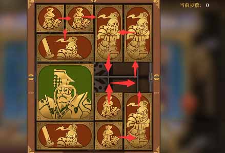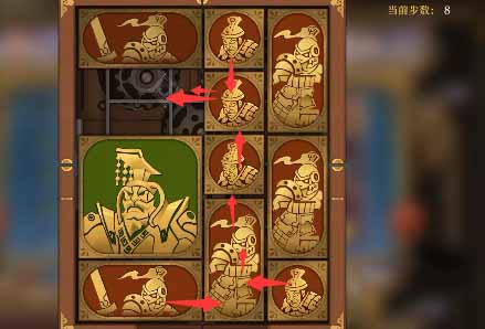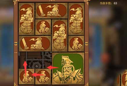5、将军向上移一格,右下角的水平方块移动到左下角,右下的小方块填到右下角的角落里,将军向右移一格,左上角的竖直方块下来,然后其右侧的全体方块左移。