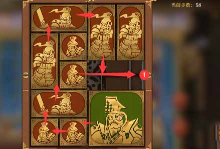 6、右上角竖直方块左移之后下方的竖直方块向上贴到右上角,将军向右移一格,左上的小方块向下移,左侧的竖直方块向上移一格,左下角的水平方块向上移一格,右侧的小方块向左移到左下角,将军再向下移一格。