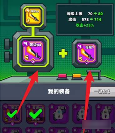两件相同的紫色装备可以合成一件金色装备,在装备页面下方的合成界面选择两件相同的紫色装备进行合成就可以合出金色的装备了。
