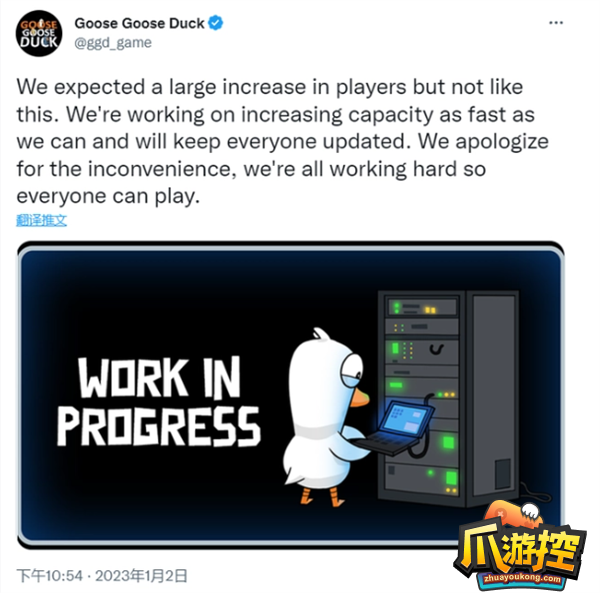 《鹅鸭杀》官方表示,虽然他们期待着玩家大量增加,但一下子增加25万名玩家让他们始料未及,官方正在努力地扩充服务器容量,并让每个人都能了解到最新情况,对于给玩家带来的不便,官方深表歉意。