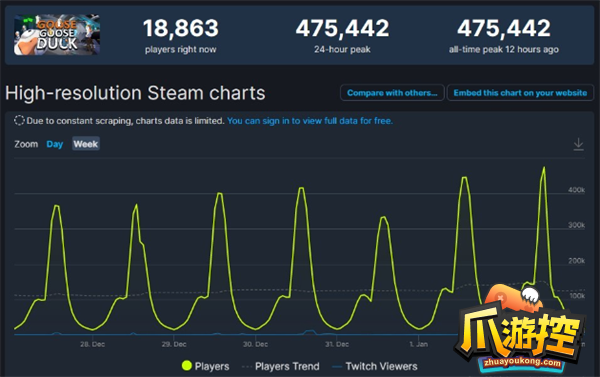 根据SteamDB的数据,《鹅鸭杀》目前同时在线玩家峰值已超过47万,而在几个月前,这个数字还不到1万。