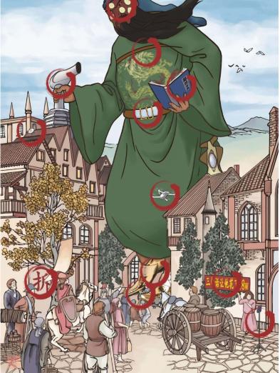 2、图中间站着巨人关羽,他拿着吹风机和葵花宝典,脸上是黄瓜面膜,腰间是腰带