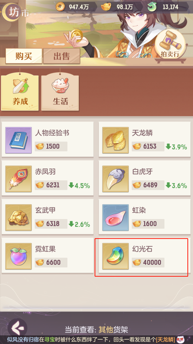6.幻光石在坊市的价格为4w元宝一颗。其他获取途径为寻宝罗盘、天仙下凡等途径获得。