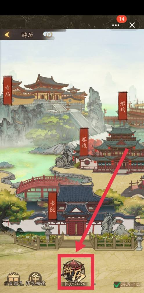 1、进入城郊,选择【游历】选项。