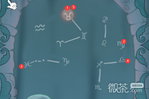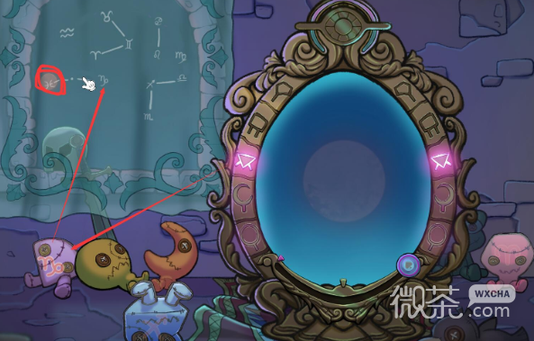 镜上的图案对应相应的玩偶,玩偶上的星座对应窗外的方位(连线表示是一起的)