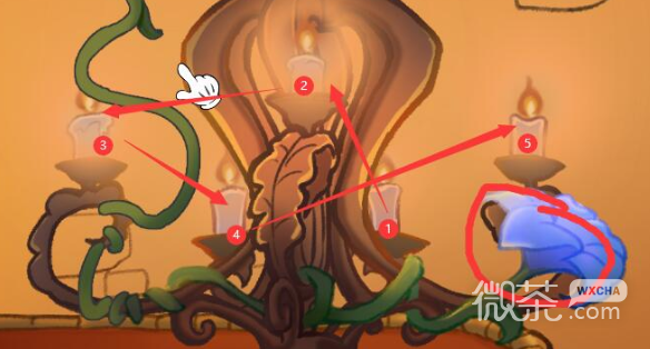 先将书桌上的蜡烛点亮,按照右边画里的提示依次点亮烛台