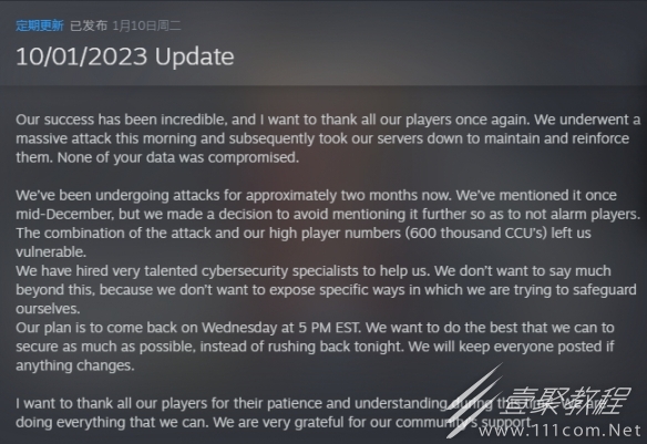 服务器将于美国东部时间周三下午5点(北京时间周四早上6点左右)重新开放。