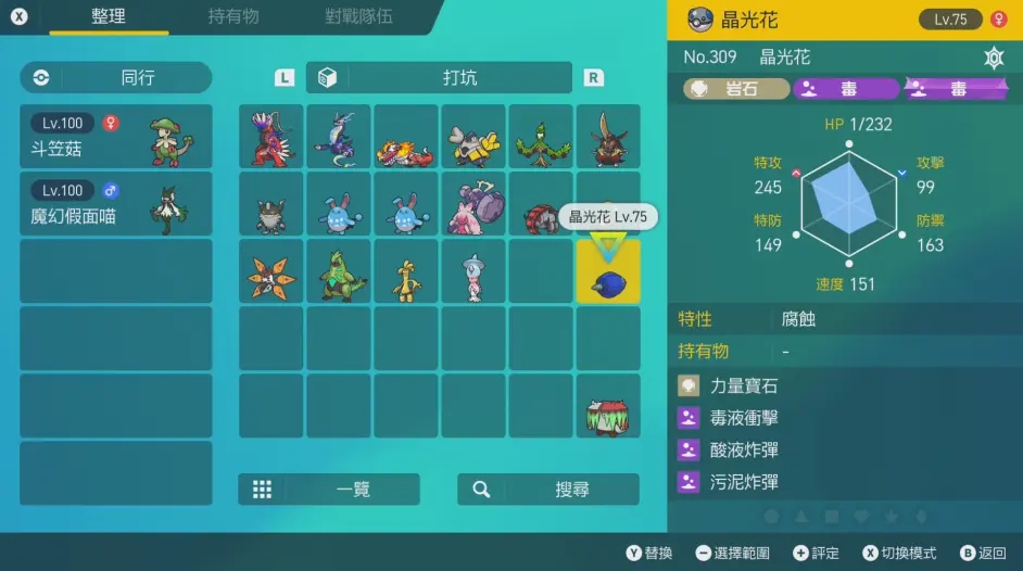小虚吾伊德,平时用酸液炸弹削特防的同时攒太晶珠能量,然后毒爆弹输出,中毒时用毒液冲击伤害最大化,做岩系打手也行,不过特攻招只有力量宝石,记得加满PP