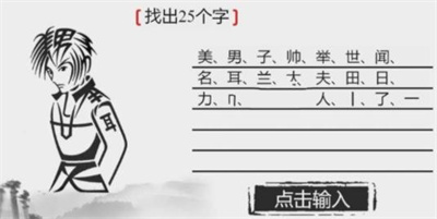 1、需要从【美男子】字中找出25个字,分别是:美、男、子、帅、举、世、闻、名、耳、兰、大、夫、田、日、力、巾、门、兴、人、丨(gun)、了、一、二、三、刀、夕、口、叶、月、日、艹、久、干、土、士、王、羊、入、廿(nian)、十、火、川。
