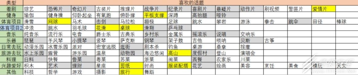 高珊珊喜好项目如下: