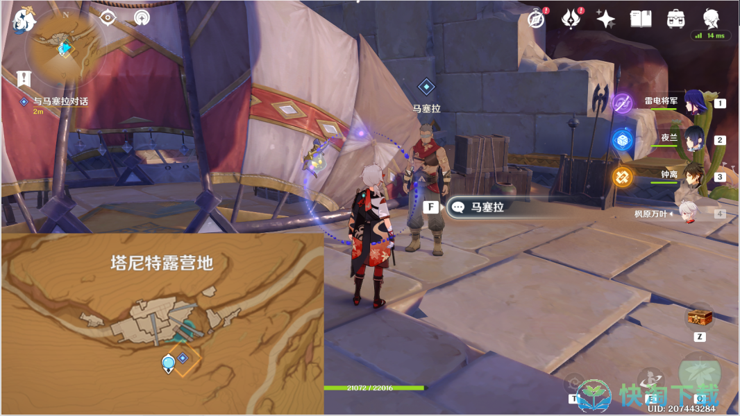 7、随后传送千壑沙地神像,到塔尼特露营地,再次与马塞拉对话。