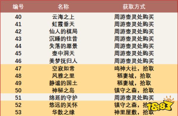 除了可以在大世界拾取的24个,其他全部在周游壶灵处购买,可以对照下表排查,需要拾取的我已经将底标黄了。