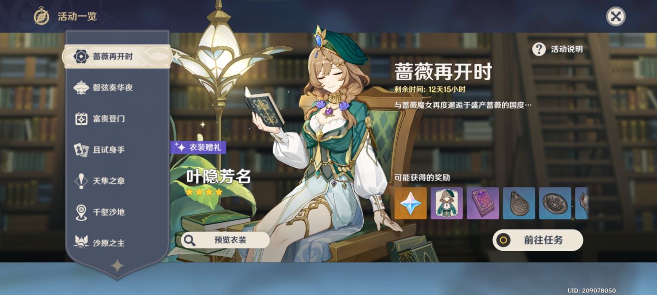 全新任务是跟活动《蔷薇再开时》挂钩的,可以获得全新丽莎时装「叶隐芳名」(4★)
