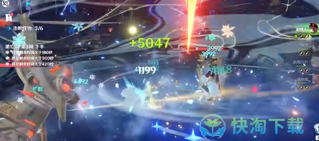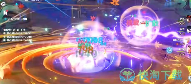 2、下半开启挑战直接往后之后,等右边蓝色剑鬼跑过来再跑回主体后面捡,就可以将怪聚集在一起输出。