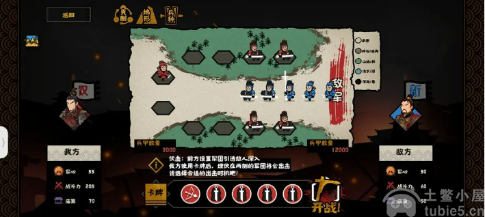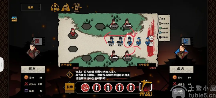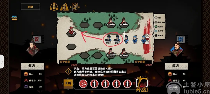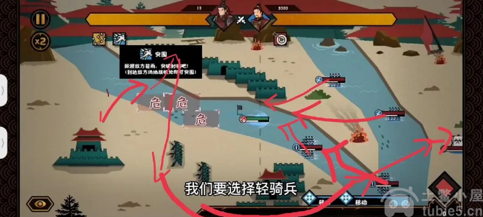 我们前期先把骑兵往上拉这样的话王莽的军队就会被吸引这样的话他就会往上走而下方有一个洞我们立刻往下拉通过那个洞就可以胜利了是不是非常简单呢?