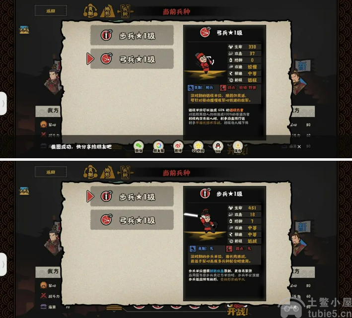 这里就会有人问了为什么开头选弓兵而剩下四个选步兵呢因为啊前方的弓兵作为吸引吸引两个步兵而恰好弓兵就是远程射手这样就能吸引到两个步兵这样后方步兵的难度就大大减少意思对战三个