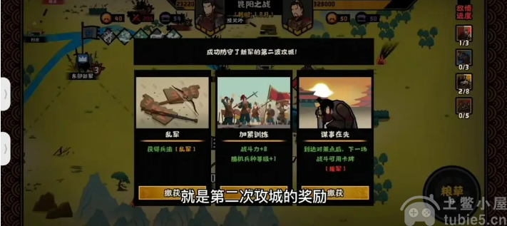 然后我们打不了多久就会迎来第一次攻城这里的话大家也不要慌全选择弓兵尽量前期多升级弓兵这里的话会给一个绿林军然后我们围绕着这个防御塔在远程攻击然后一直拉一直拖千万不要正面硬钢我们是打不过王莽的当我们胜利之后会有三个选项这里的话,大家别忘了先存一下档如果弄到没有自己喜欢的可以重新打一次我这里是推荐巨人的第一可以当肉盾而且他本身还可以打乱对方的阵脚所以是很推荐大家的