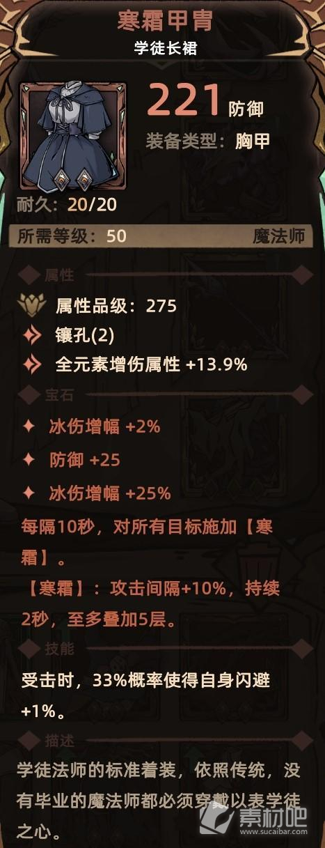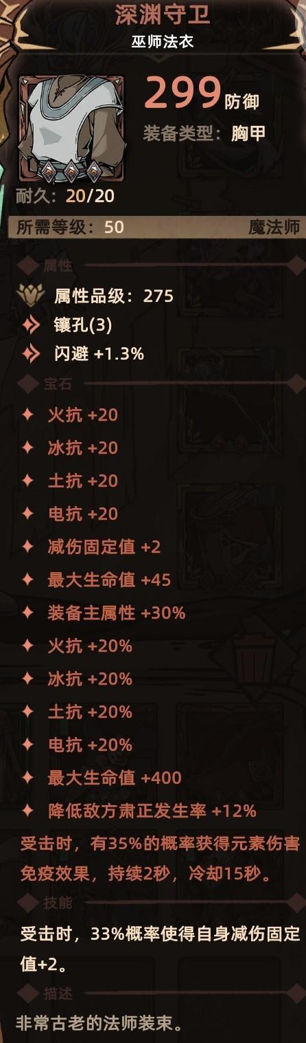 关键词:装备主属性、元素抗性、生命、降低肃正、元素免疫(受击触发)