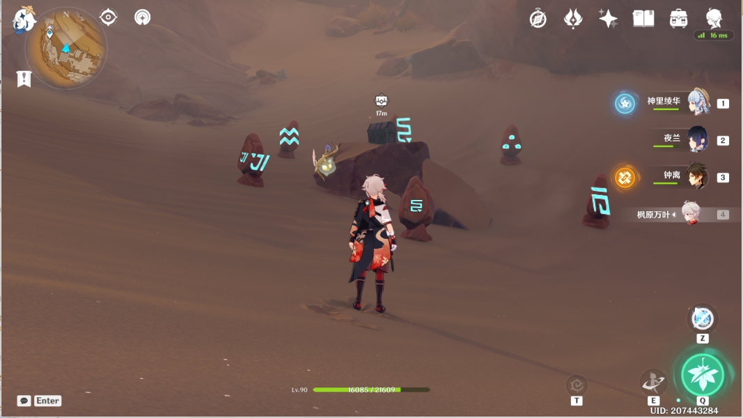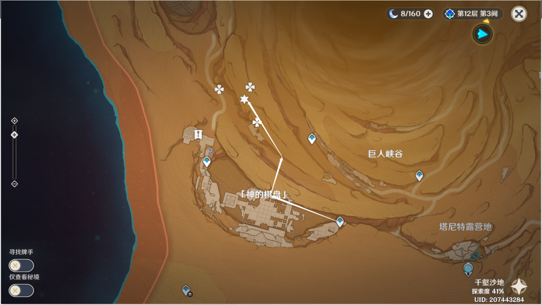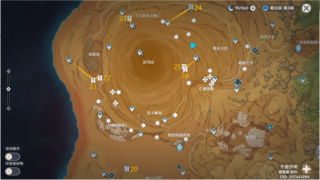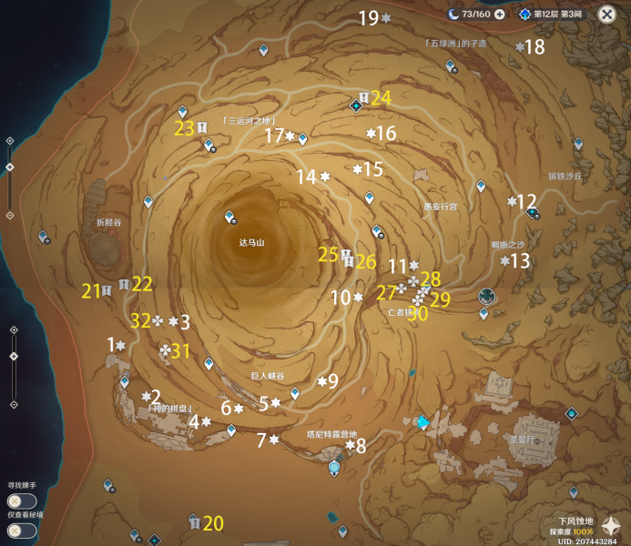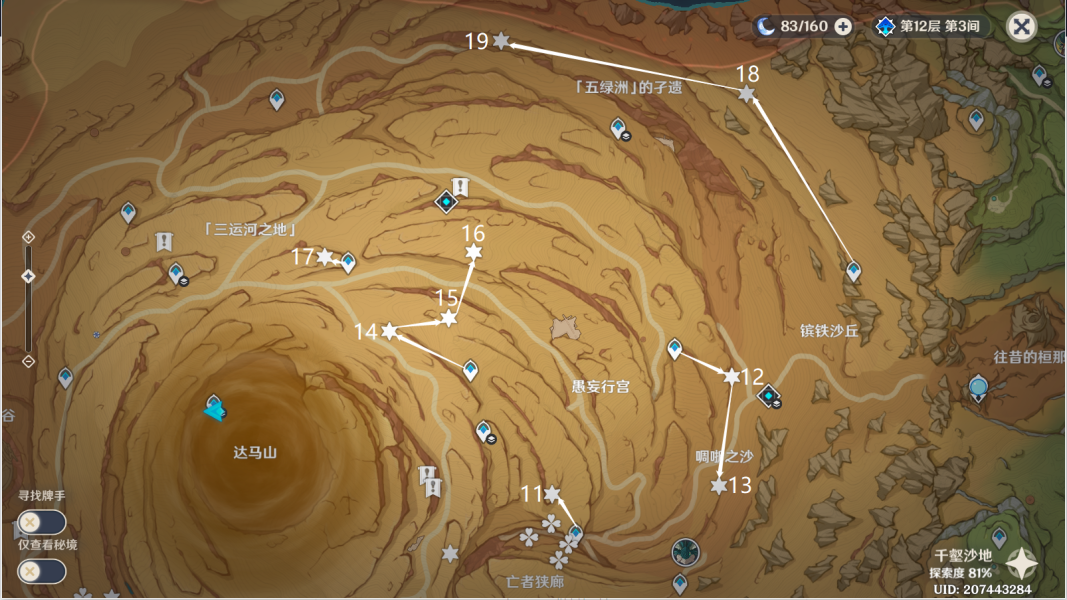 27、完成任务[埋葬丰饶的沙丘中]。传送愚妄行宫西南方向地下锚点,往地图的东南方向通道一直走。按图中显示解密。>>埋葬丰饶的沙丘中